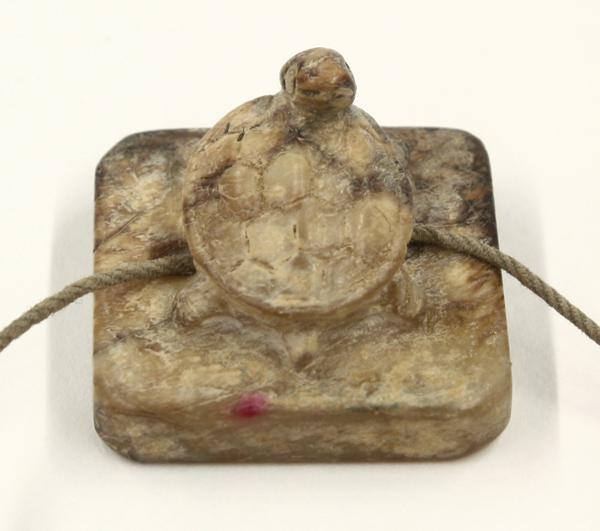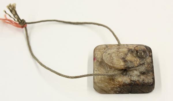 Chinese small archaistic jade seal, the square plinth surmounted with a turtle with legs and tail extended and its head with a long neck and resting on its shell, the underside reads 'tian bao shan yin', the tan-colored stone with russet and dark striations, 1.9'' (2.5cm); Provenance: property of a Bay Area collector