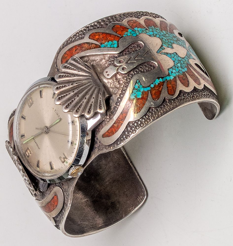 c1970 This piece was made in the 1970s by famous Navajo silversmith Tommy Singer. Signer was introduced to the art of silversmithing from his father at age 7. In the 1960s he developed the chip inlay design, which became known as his signature technique. This watch features the chip inlay design using turquoise and heishi to enhance the bird design. The watch measures 3" across and 2" tall. - HKA#66116