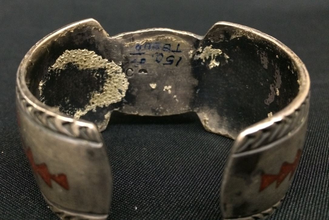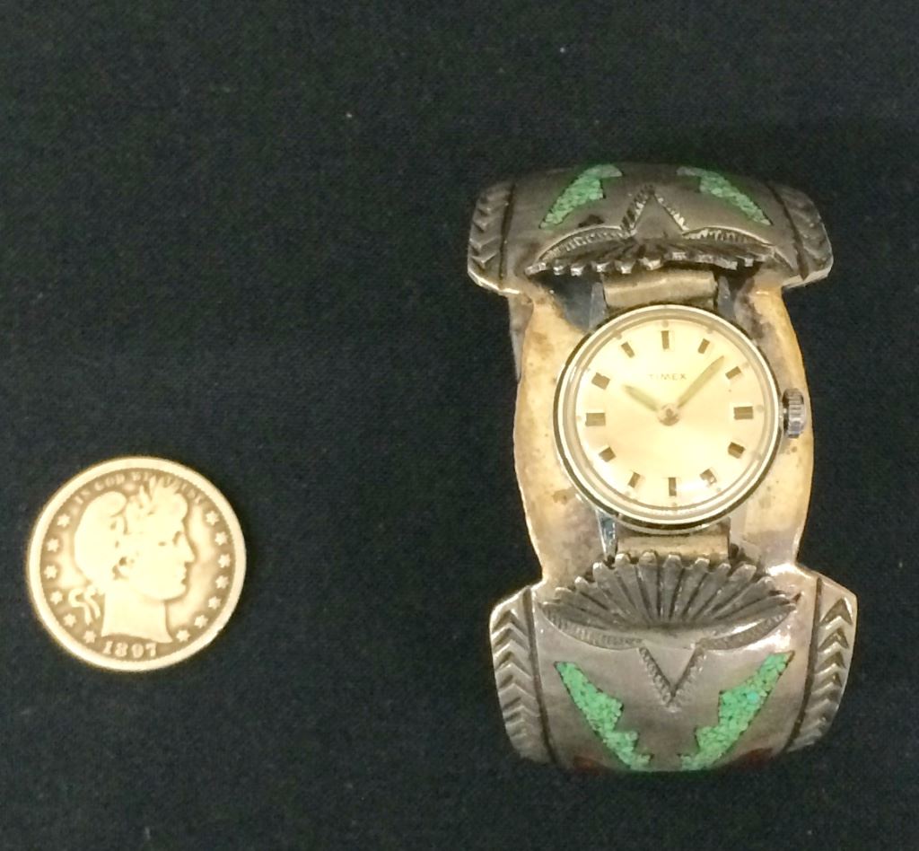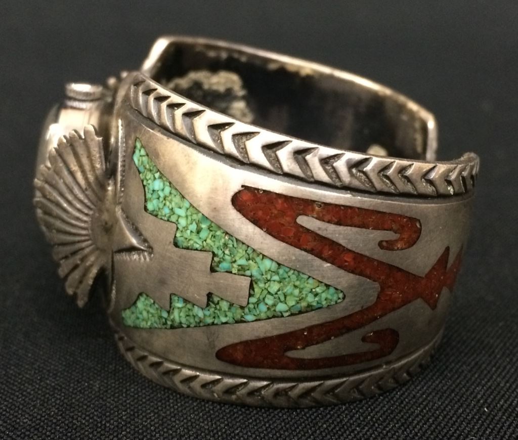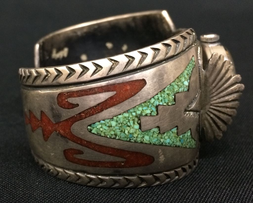 This vintage chip inlay watch cuff was tested as sterling silver and has Carl Allen Begay’s hallmark. Measures 5.75” inside circumference plus there is a .75” opening. It is 1 3/8” at the widest point and weighs 71g