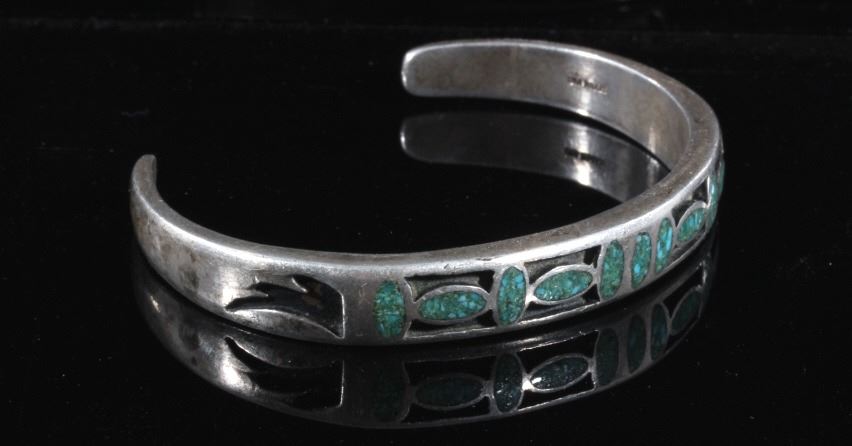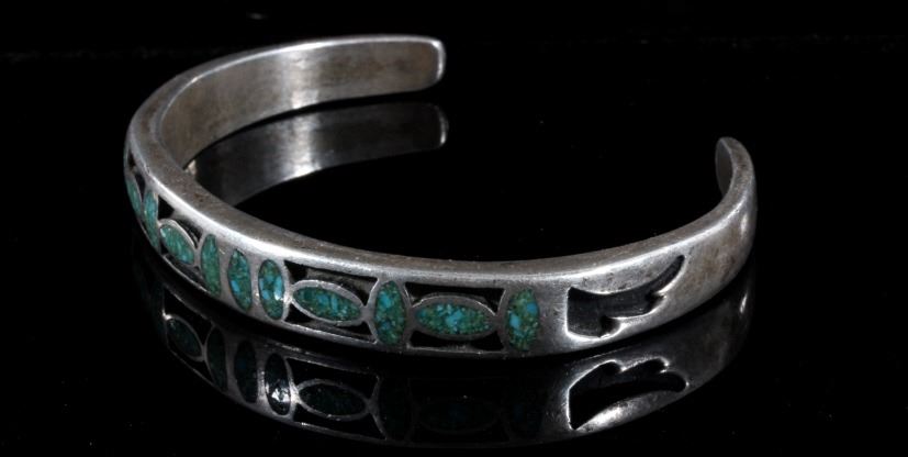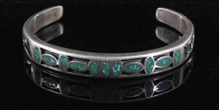 For your consideration is a Navajo chip turquoise and sterling silver cuff. This marked sterling bracelet features 11 ovals all containing chip turquoise and they are set within the bracelet, framed by simple carved cavities. Interior dimension of the cuff measures 6.5"