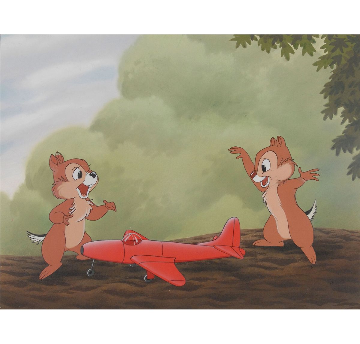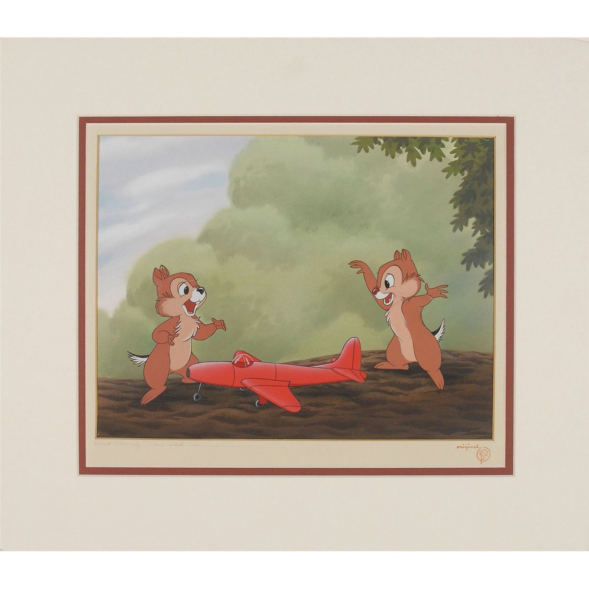 (Walt Disney Studios, 1951) Original production cel and custom prepared background featuring Chip and Dale from Test Pilot Donald, showing the two chipmunks with the small red plane. The cels are trimmed to image and placed on a hand-painted custom background as prepared by the Art Props Department at Disney Studios. Image measures 9 x 4.5, with a mat opening of 11 x 8.5. Mat dimensions are 16.5 x 14.5. In fine condition, with a bit of chipping and lifting to paint. In the short, Dale dreams of flying and finds a perfect opportunity when Donald Duck's remote control airplane gets stuck in their tree. A nice setup with an Art Props mat.