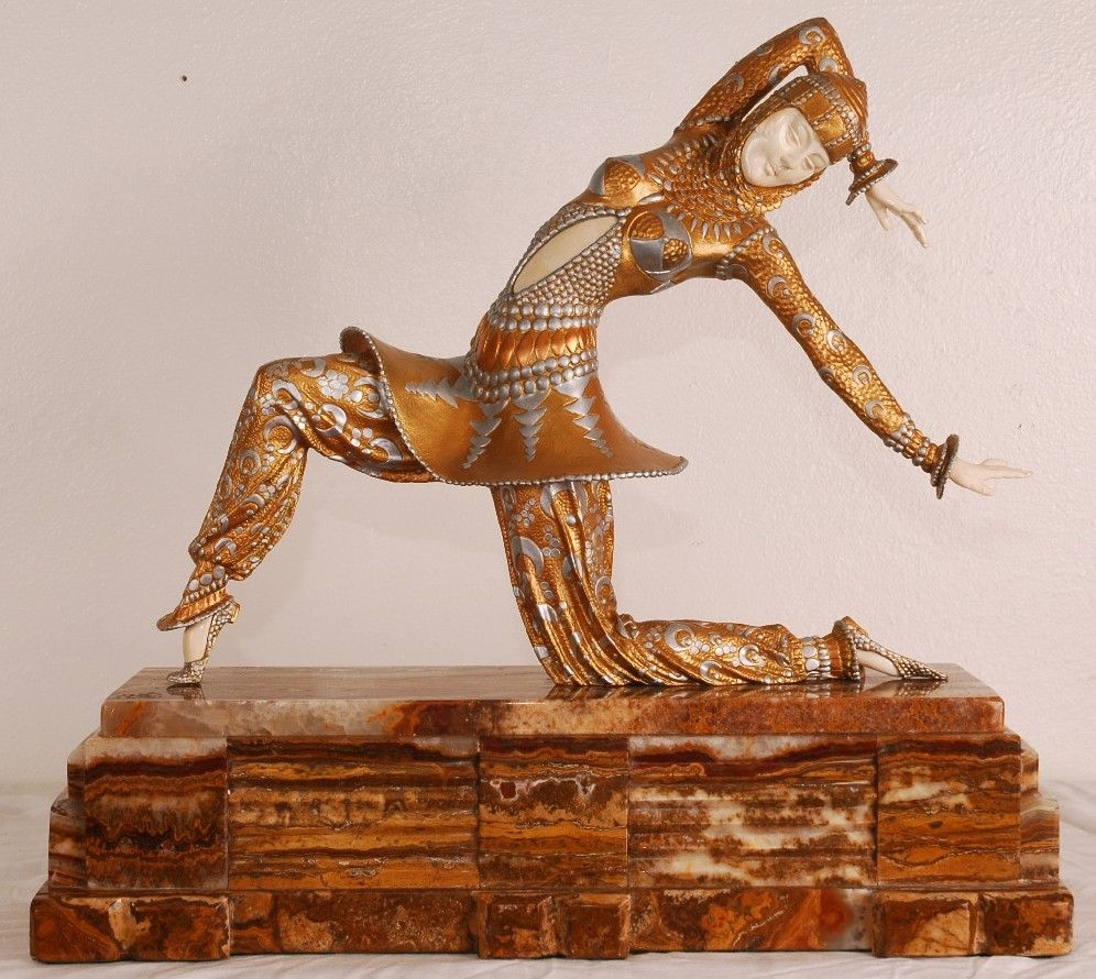 After Dimitrie Chiparus "Carmona" on large rectangular multi tiered tan and white marble base. Dancer's clothing accented in gold leaf. 21"L x 20"H x 6"w.