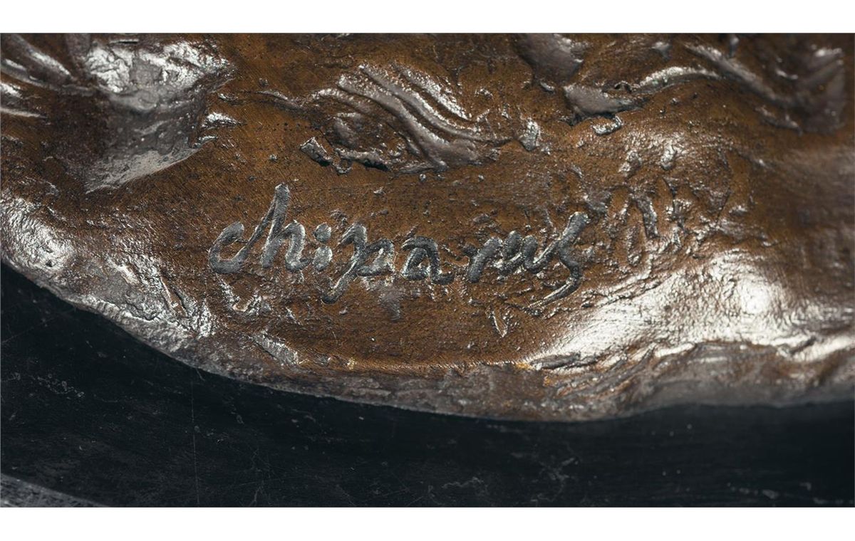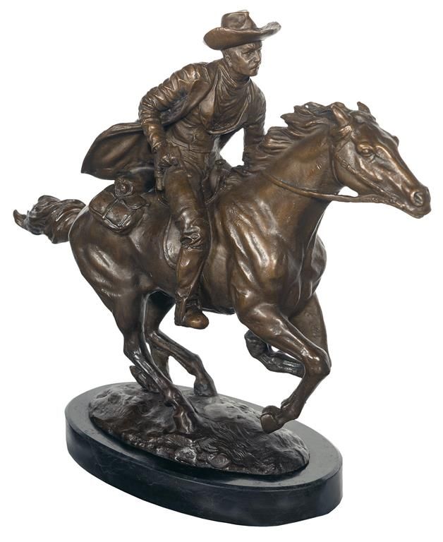 This Chiparus marked bronze depicts a western rider with gun in hand on a running horse. "Chiparus" is marked on the base. Mounted on a black marble plinth. The sculpture measures 14 inches tall x 17 inches wide x 5 1/2 inches deep and weighs approximately 25 pounds.
