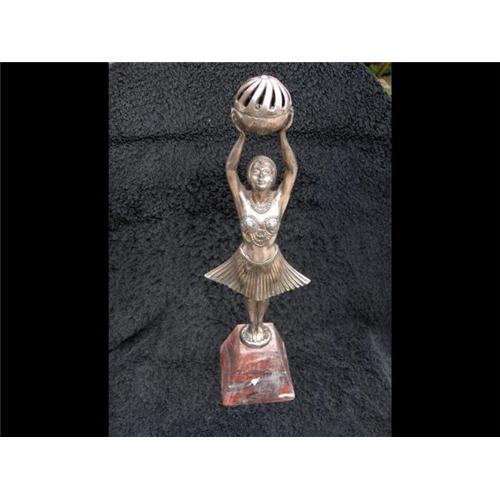 We are delight to offer for sale this lovely French Art Deco Perfume Burner dating from around 1930. Although unsigned this statue exhibits all the skill associated with Demetri Chiparus (1886-1947), having a fanning pleated skirt, Fishscale Skull Cap and Bobbed hair. Although made of spelter this piece is obviously of the highest quality having been silvered. She stands on a Rouge Marble pyramid and is in very good condition. Guaranteed original and of the period. A truly delightful piece.