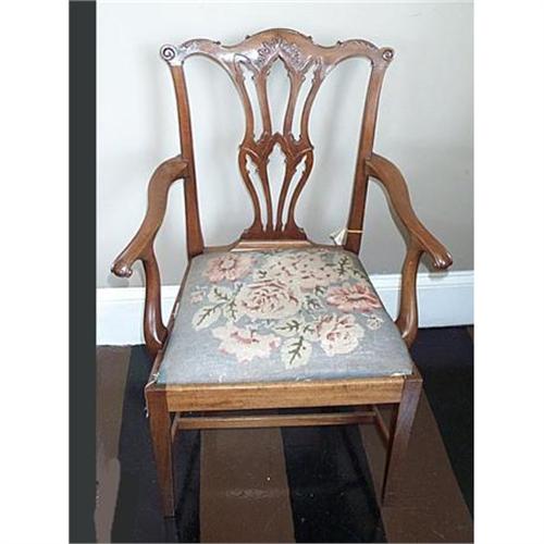 Diminutive Chippendale arm Chair is made of Mahogany with an upholster drop-in seat. The detailed carving and graceful arms add to its beauty. This small size indicates that it was custom made for a petite lady. The needlepoint upholstery is in need of replacement, the finish is in good order.<p> If one has any further questions or would like us to supply other images of this article please don?t hesitate to email us. We will do our best to accommodate your request as soon as possible.