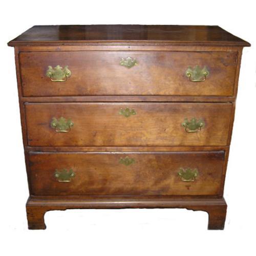 This country chest of drawers in Chippendale style is made from cherry and dates from the early-to-mid 19th century. Measures 38.5" wide, 20.25" deep, and 36.25" high. Batwing pulls and escutcheon brasses are original. Faux keyholes. Ogee bracket feet. Fine patina. Finish is certainly very old and appears to be original. Hand-cut dovetails. This item resides on the upper west side of Manhattan ( New York city ) and may be seen by appointment.