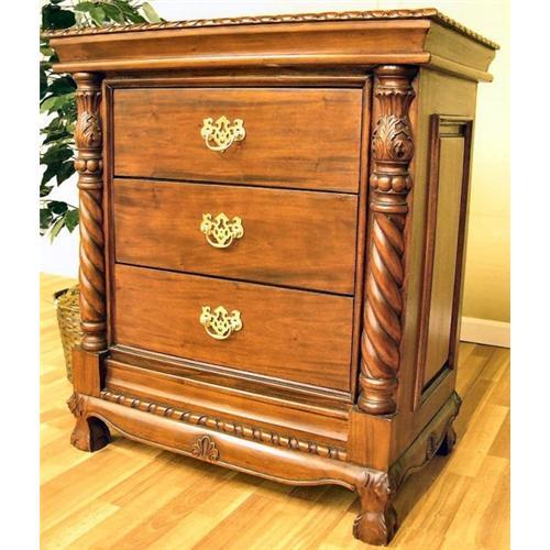 New hand carved solid mahogany bed side table / nightstand. This piece is constructed from heavy solid mahogany wood and build to last a lifetime. This piece is finished with rich mahogany stain.