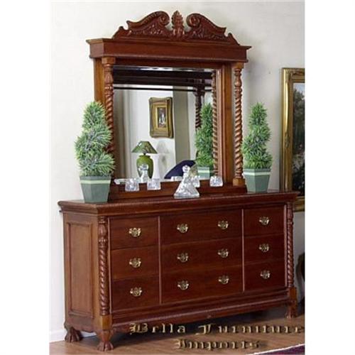 This Dresser is finished with rich mahogany color. The dresser comes with a removable mirror back that feature a gorgeous ornate crown carved in solid mahogany wood; the bottom section features 9 large drawers to accommodate all your belongings.