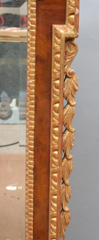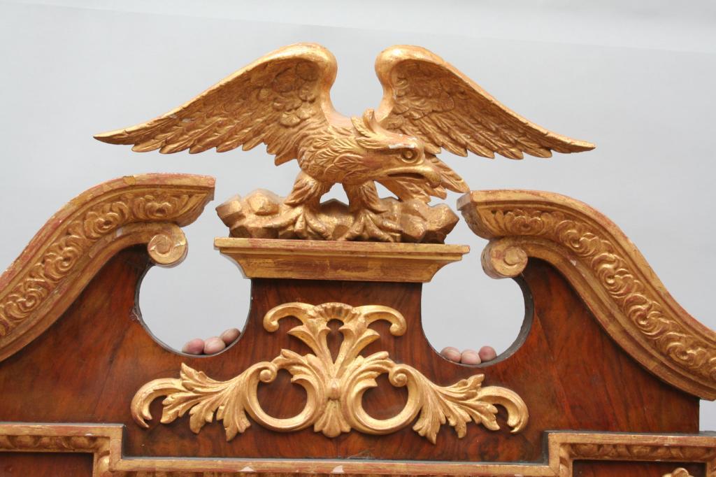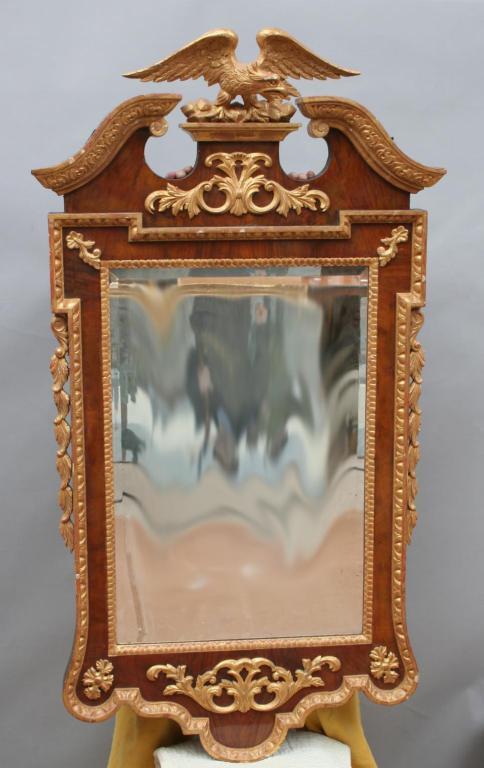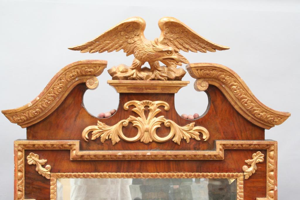 Late 19th century, the domed form flanked by carved and gilt pendant bell flowers, accented with carved and gilt scroll work, surmounted by a carved and gilt eagle finial. 56" x 29". Condition: good, some light losses to edge of mirror frame, generally very good.