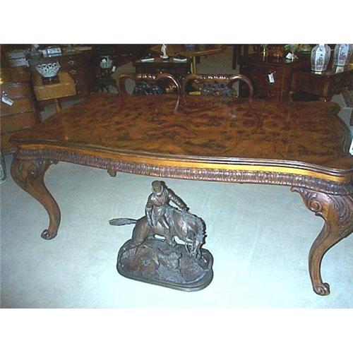 Exceptional Chippendale Style Walnut Library Table with Serpentine Shaped Sides, a Burl Walnut Top on Carved Cabriole Legs to a Scroll Foot