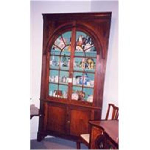 Chippendale architectural corner cupboard of walnut with wonderful moldings, 4 shelves in the main section of the cupboard behind glass doors and 2 shelves below behind 2 walnut doors. Pennsylvania or New Jersey.