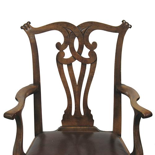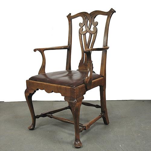 Chippendale maple armchair; carved crestrail over pierced splat; curved arms; straight seat rail; block and turned stretcher; slipper front feet; early 20th C.; 40" high x 24 1/2" across x 18 1/2" deep (no visible defects)