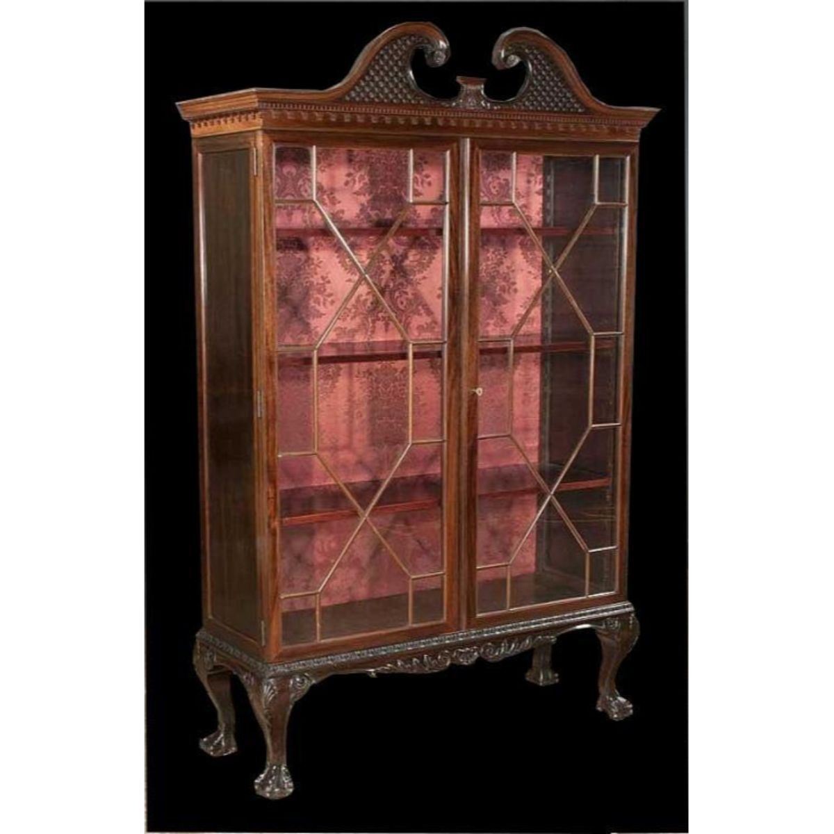 Chippendale-style mahogany bookcase cabinet. Pierced broken arch pediment, thirteen pane Mullion glass doors, carved apron & ball & slaw feet. HAS KEY for door lock! c.1890. 50"W X 17"D X 78"H.