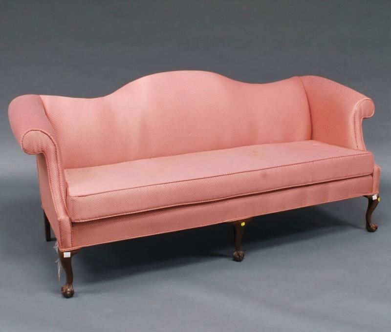 Chippendale-style Upholstered Camel-back Mahogany Sofa, 20th century, ht. 35, wd. 80, dp. 34 in.