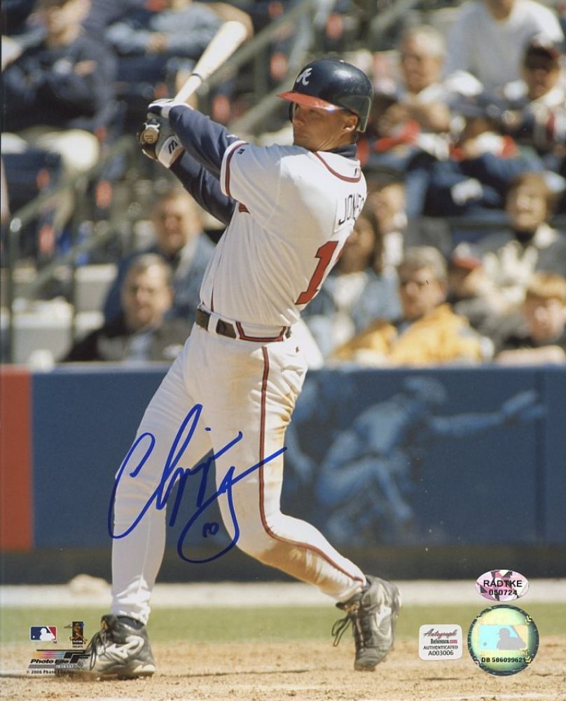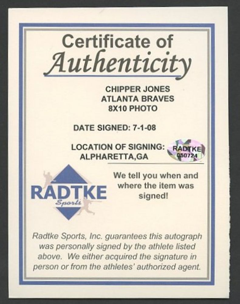 8x10 photo hand-signed in blue felt tip pen by Chipper Jones. Autograph includes an official Autograph Reference (AR) COA for authenticity purposes. Also includes a Radtke COA.