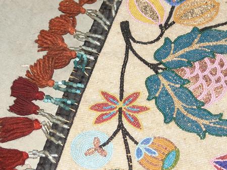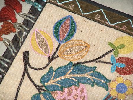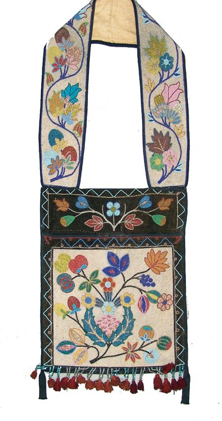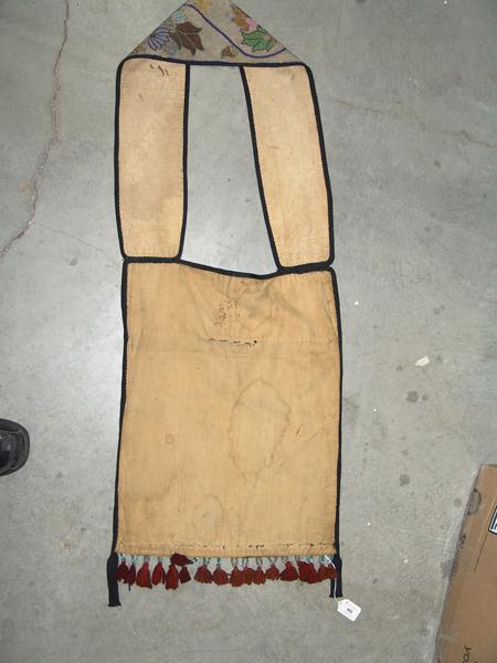 Circa Early 1900s, Fantastic bandolier with curvilinear floral designs with white ground on velvet. Suspensions of wool tufts and bugle beads. Very fine condition. 43" x 18"