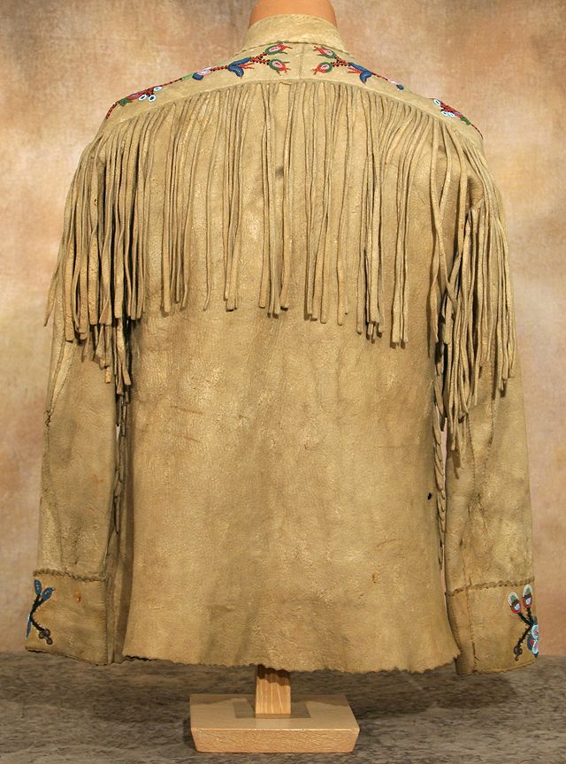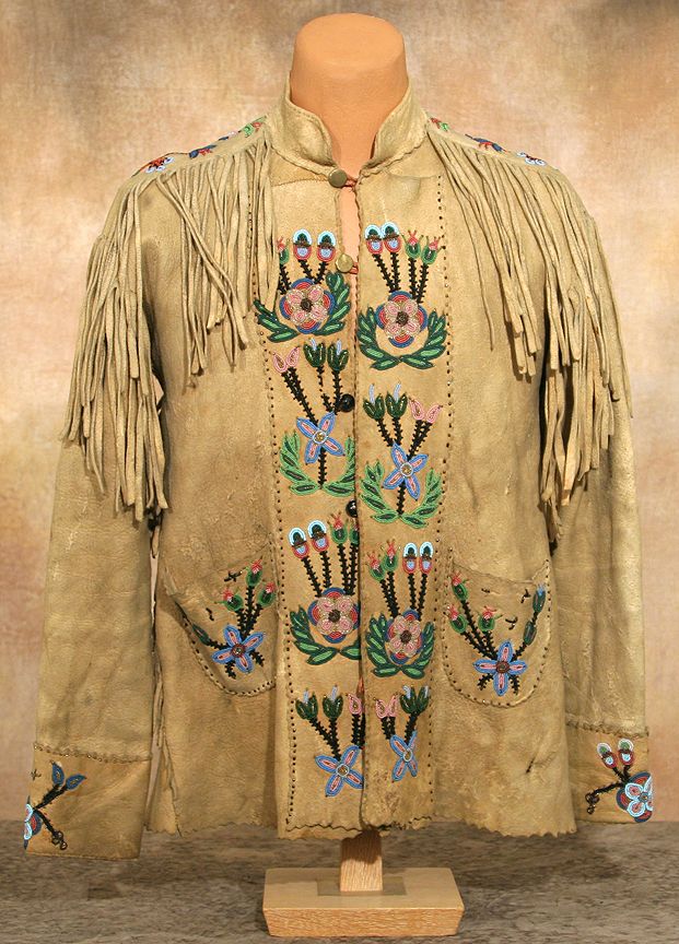 Chippewa Beaded Coat. 30" long with highly decorative floral beaded panels down the front, across the back, on the cuffs and front pockets. Moose hide with long fringing. All hand sewn. Circa 1870-1880,. (est. $3,000-5,000). CONDITION REPORTS: www.auctioninsantafe.com/docs/cr2012.pdf