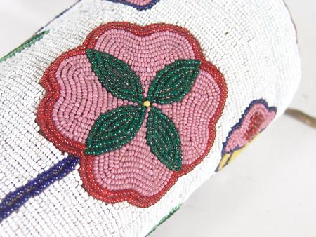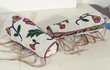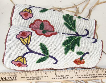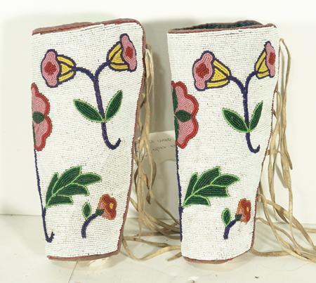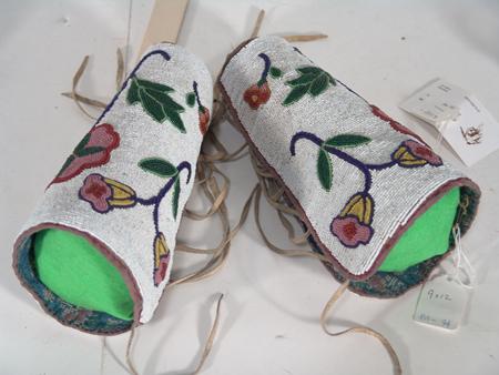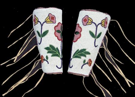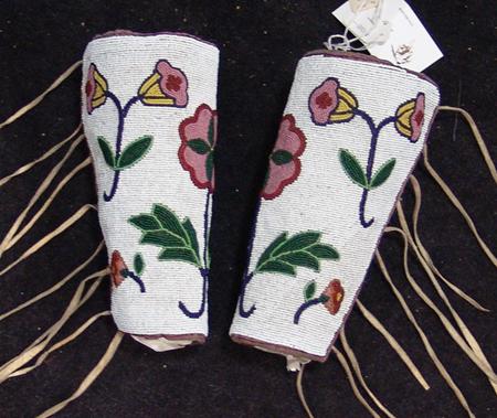Beautiful, fully beaded cuffs with traditional floral design on white field. These are a rare find - they match lot #474 and were collected together. Condition: very good. 9"