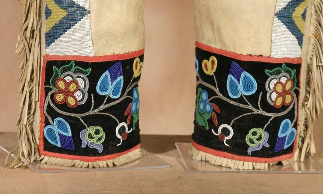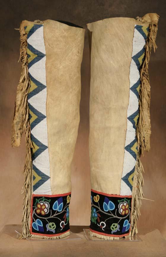 Chippewa Man's Leggings. 29" x 12" each. Buckskin with loom beaded strips & French velvet beaded bottoms. Circa 1880. (est $2,000-3,000). Provenance: Monroe Killy Collection, Minneapolis, MN. With Killy tags. For condition reports please visit: www.auctioninsantafe.com/cr2011.pdf