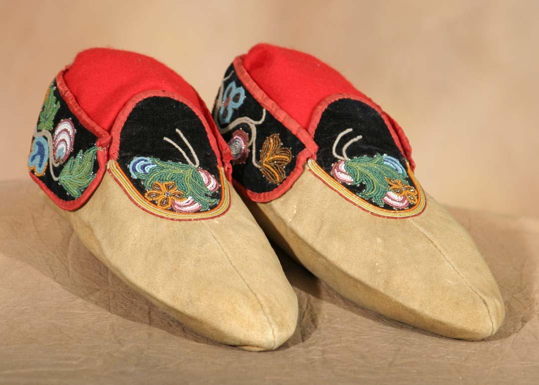 Chippewa Beaded Moccasins. 10" long. Museum quality deer hide, pucker toe construction. Cut beaded vamps & cuffs with 5 rows of silk wrapped horsehair bordering. Circa 1880. (est $1,200-1,800). Provenance: Ex-Fort Mille Lacs Village Museum, Onamia, MN. For condition reports please visit: www.auctioninsantafe.com/cr2011.pdf