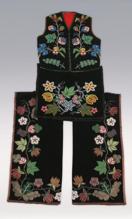 Chippewa Beaded Outfit. 21"x 18" vest. Leggings are 30 1/2x 13 1/2". Breech Clothes are 17" x 19". 19th century. Condition Report: Excellent condition.