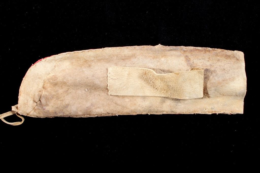 This is a beaded knife sheath and early trade knife from the Chippewa Native American Indians in the 19th Century. The sheath shows an early trade clothe in black and red with Indian tanned hide construction and shows excellent floral 19th Century glass trade seed bead work. The trade knife is wrapped in Indian Tanned hide and has a rich dark patina. Rare early set showing overall good condition with slight signs of use. Museum quality. Sheath is 3 3/8"W x 10 5/8"L with an additional 5.75"L fringe. Knife is 12.5"L. Knife and sheath together are 12.75"L without bottom fringe.