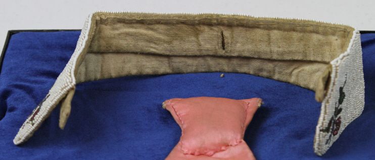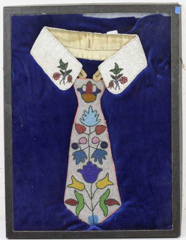 Chippewa Beaded Tie and Collar - This is all hand beaded by the Chippewa Native American's done in the shape of a tie and collar. Beautiful tight beadwork of floral designs. The condition is very good with no visible lost beads. This piece comes in a case with a glass top and is displayed very well. Measures