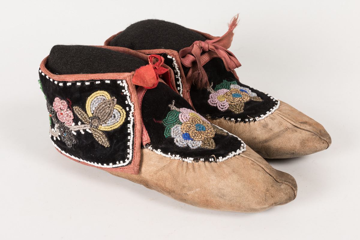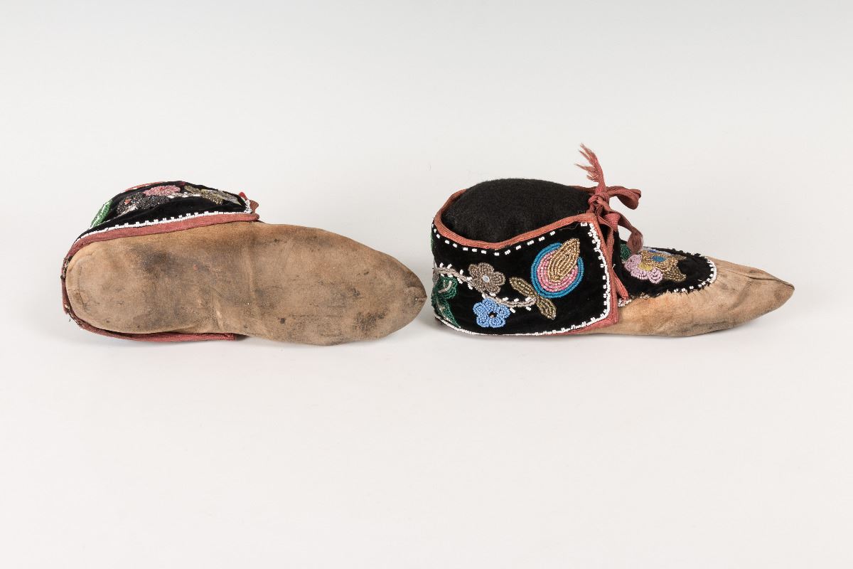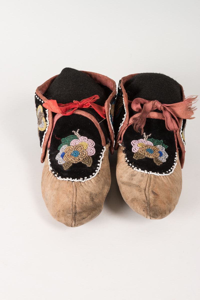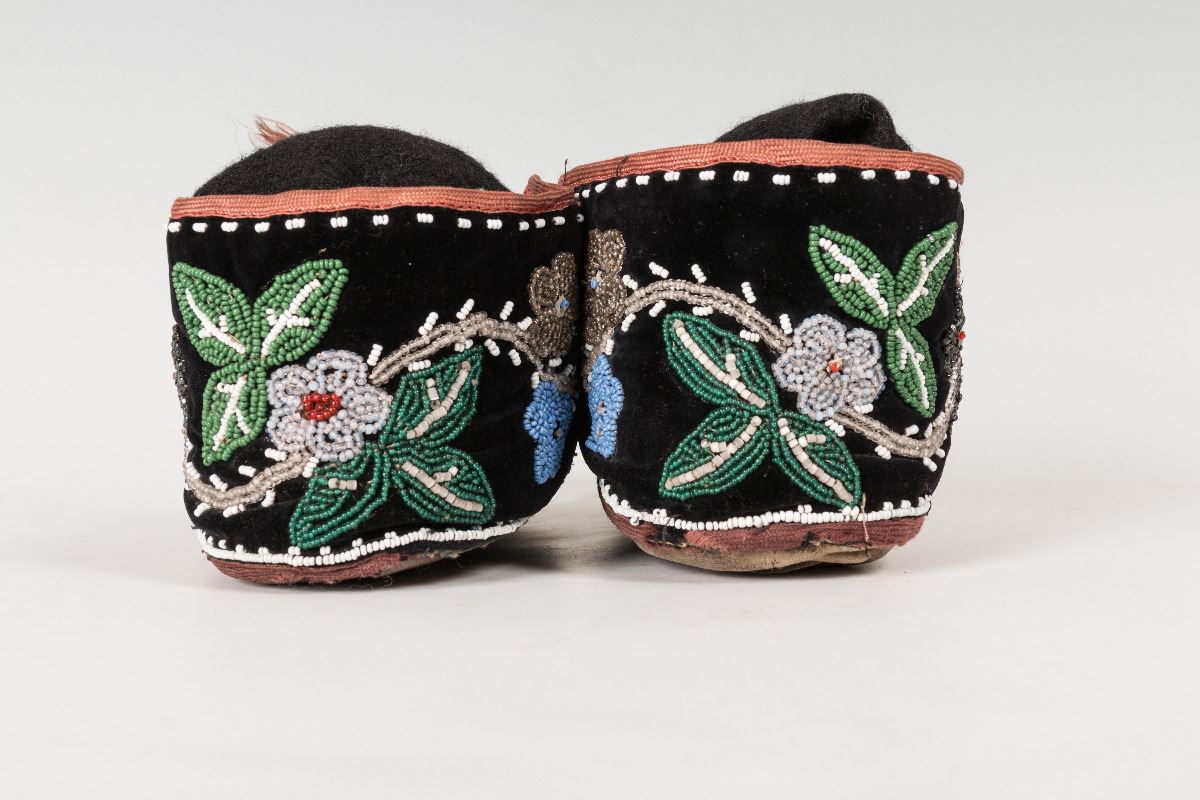 Chippewa Beaded Woman's Moccasins. 10" long with beautiful floral designs on black velvet on vamp and cuffs. Late 19th century.