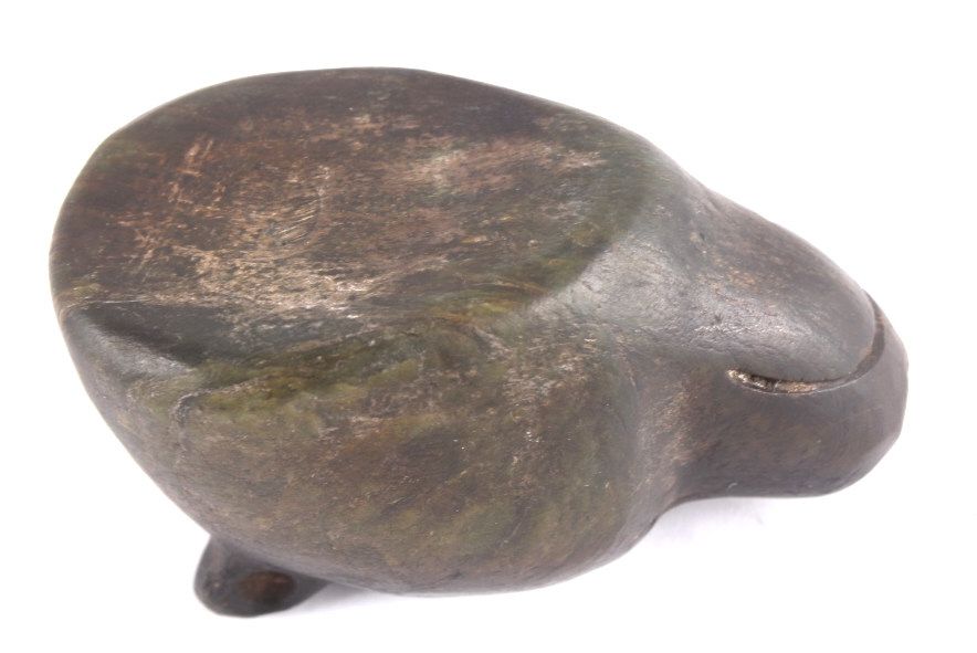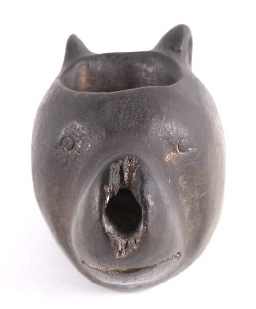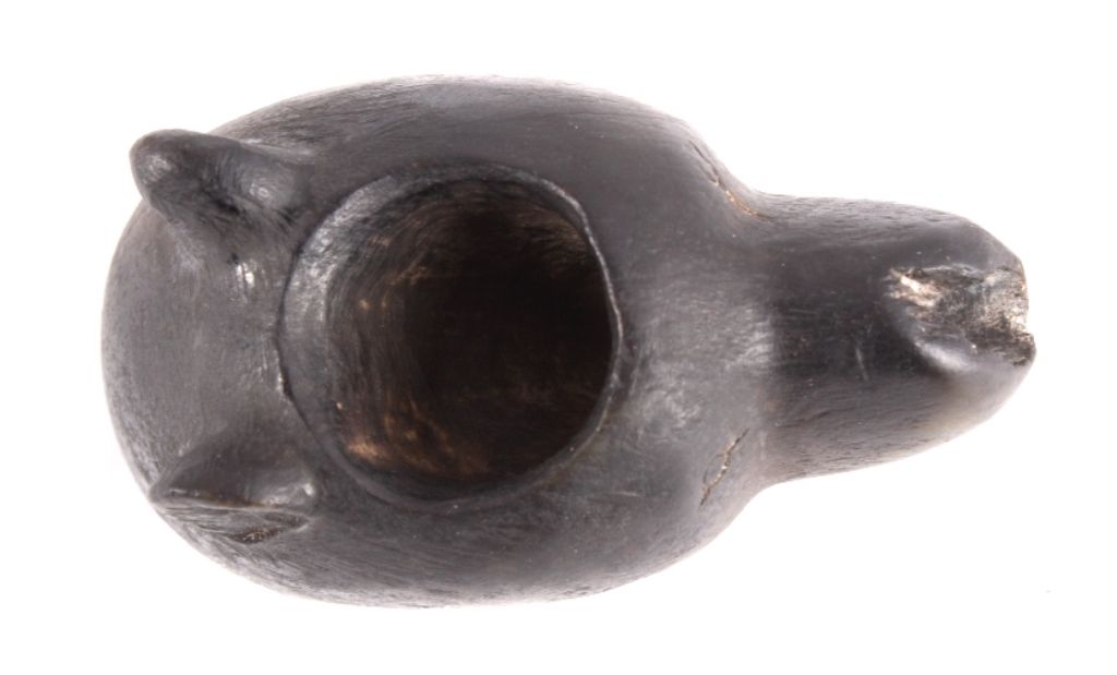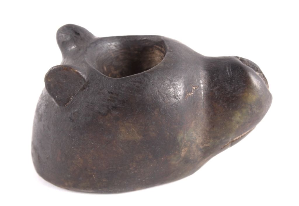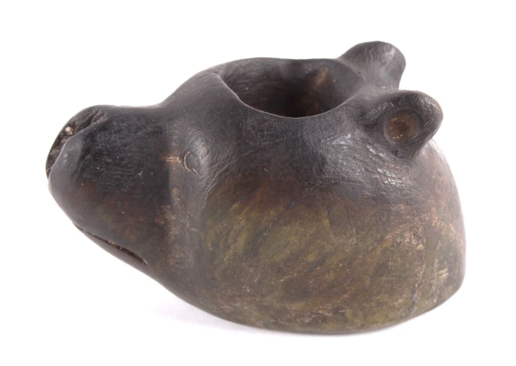 This is a hand carved Black Bear effigy pipe bowl from the Chippewa Black Bear Pipe Effigy. The piece is from circa 1880-1900 and was recovered during extended field clearance South of Austin Hollow, Kincaid Township, a cache of stone artifacts was uncovered. This odd bear-head pipe was one of those pieces. Measures 3"x1.75"x1 5/8"
