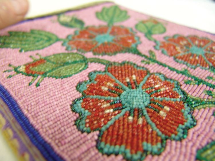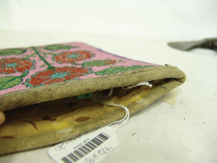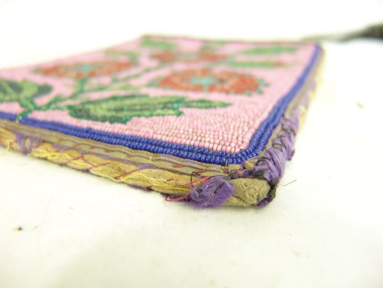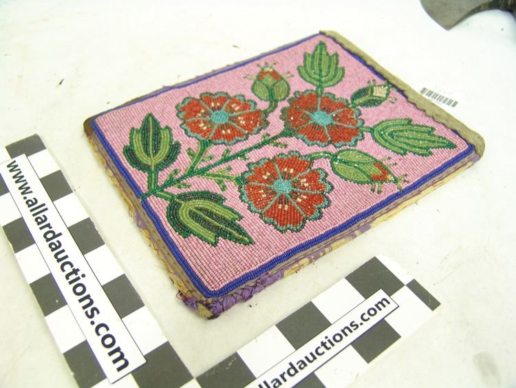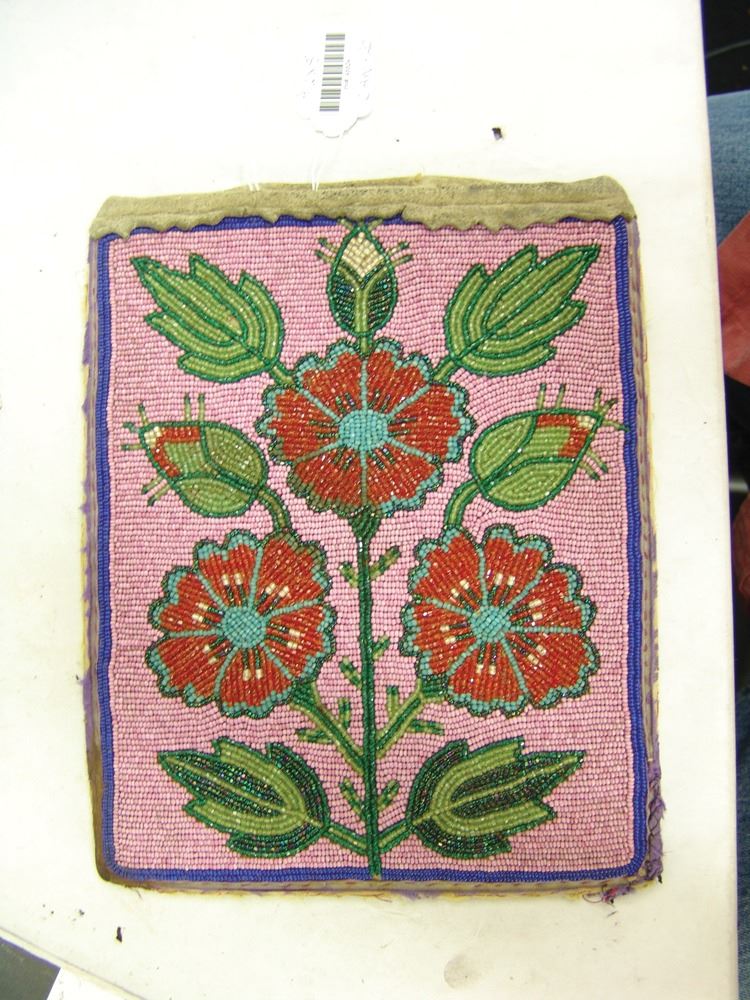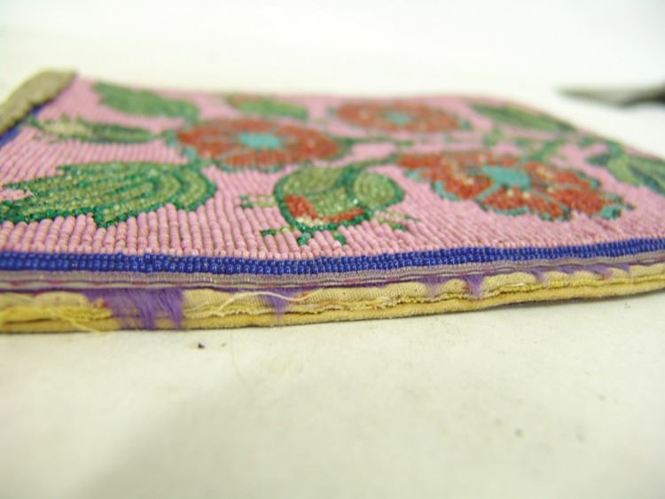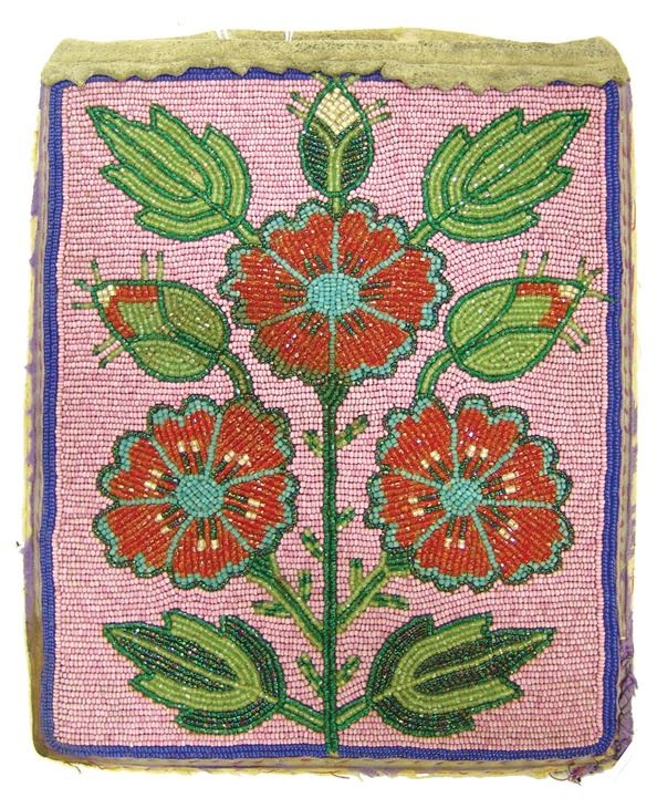Very early moose hide and ribbon trimmed flat bag the front fully beaded with flowers/florals on a dusty rose field. Good condition. Edges worn away.,Early 1900s,9-1/2" x 8" (BDWK)