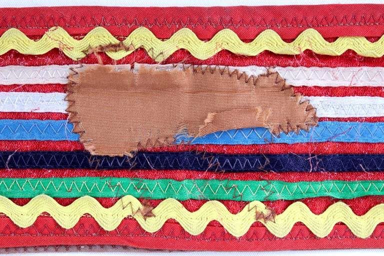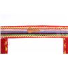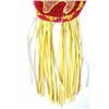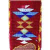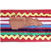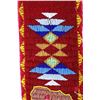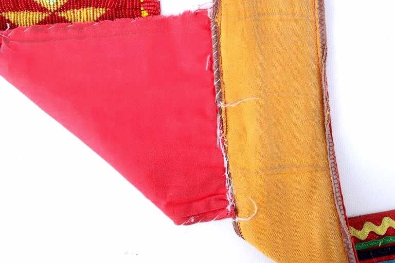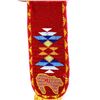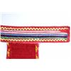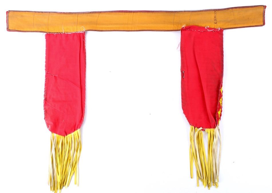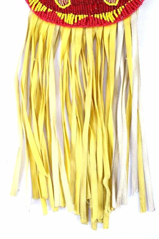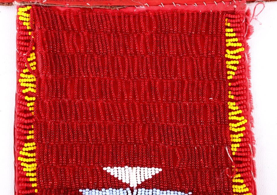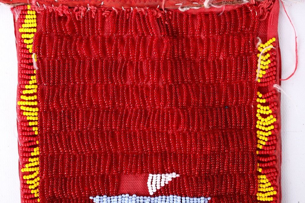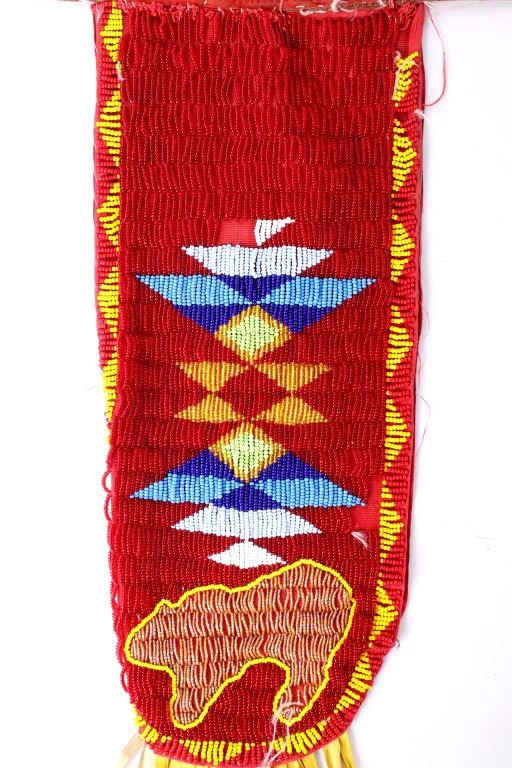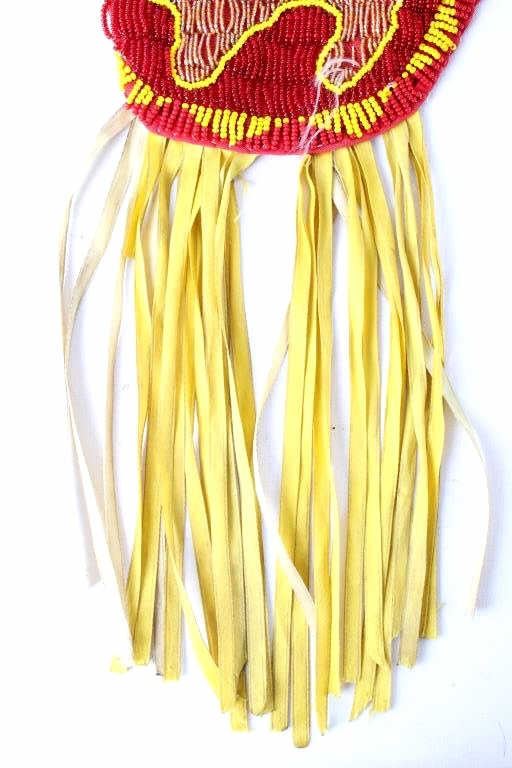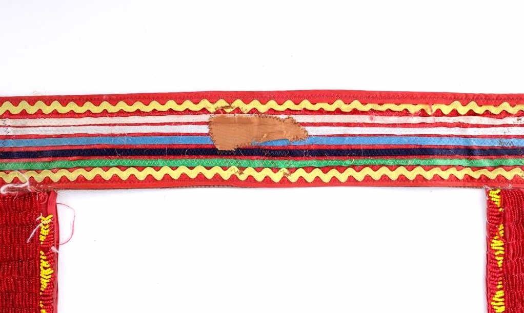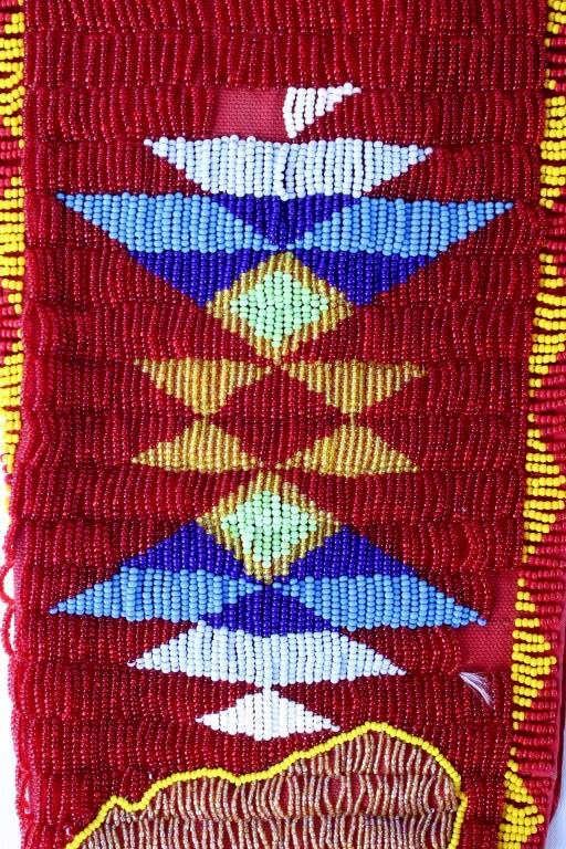 The lot features a nice Chippewa Cree Native American Indian belt with large beaded drops dating to the 1950’s. The sash or belt shows a wonderful embroidered finish in trade canvas and trade clothes’. At each outside hip the there is a large drop which shows an excellent Grizzly Bear pictorial and geometric beadwork design on early red trade clothe construction. The beadwork shows a unique and rare semi-transparent red background with corn yellow, maroon dark red, chalk white, sky blue, cobalt, medium green, light blue, semi-transparent iridescent and semi-transparent greasy yellow. The ends of the drops show a yellow silk like trade ribbon, a wonderful addition. The set shows some slight bead loss and signs of use, but overall displays very well. The belt measures overall 38”L with a strap that is 3”W. The drops are 25”L by 6”W each.
