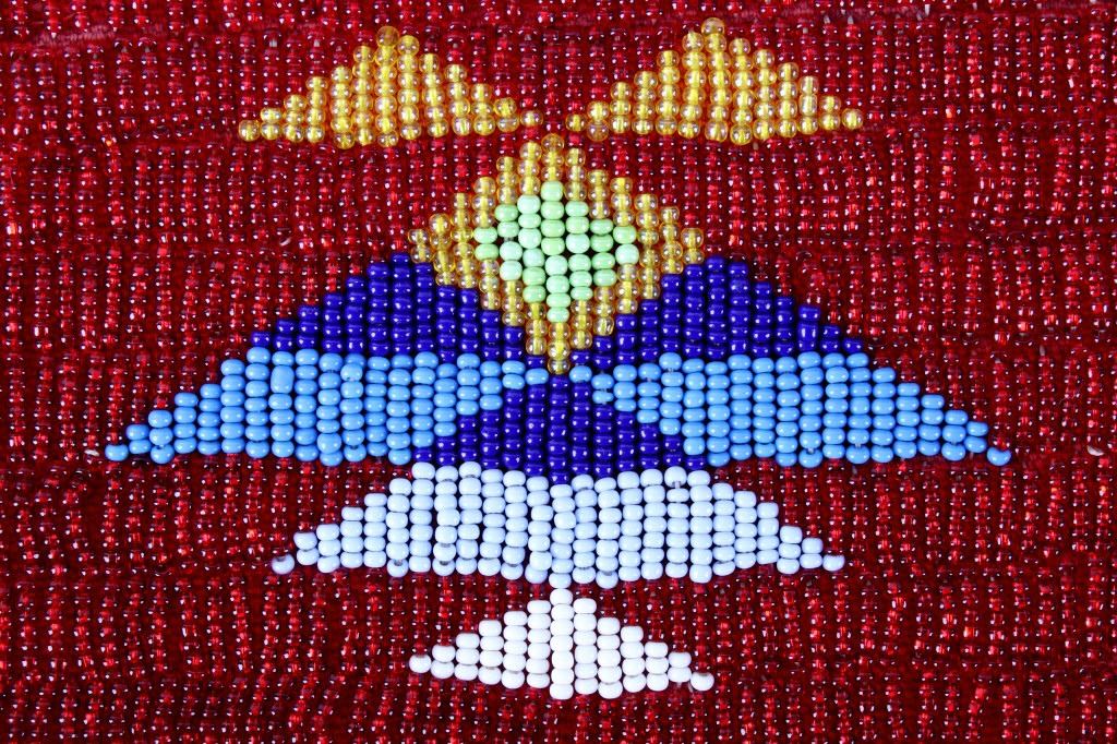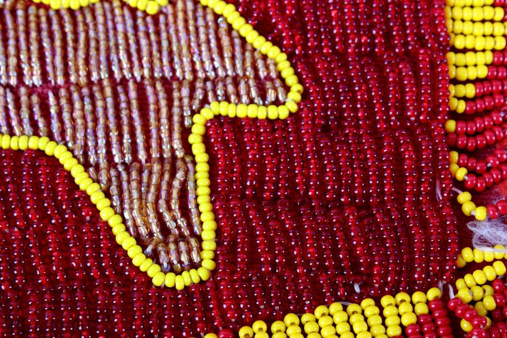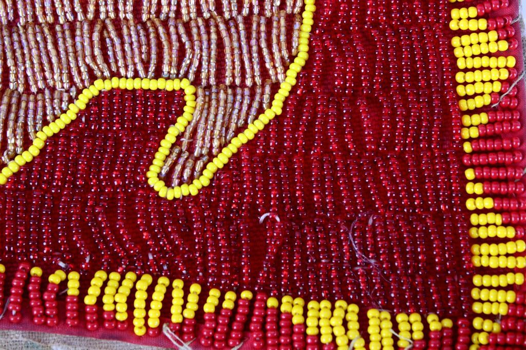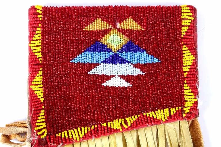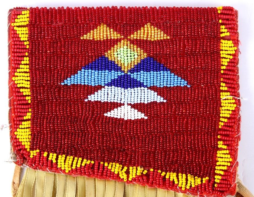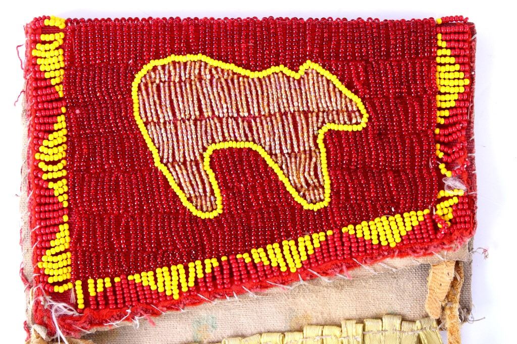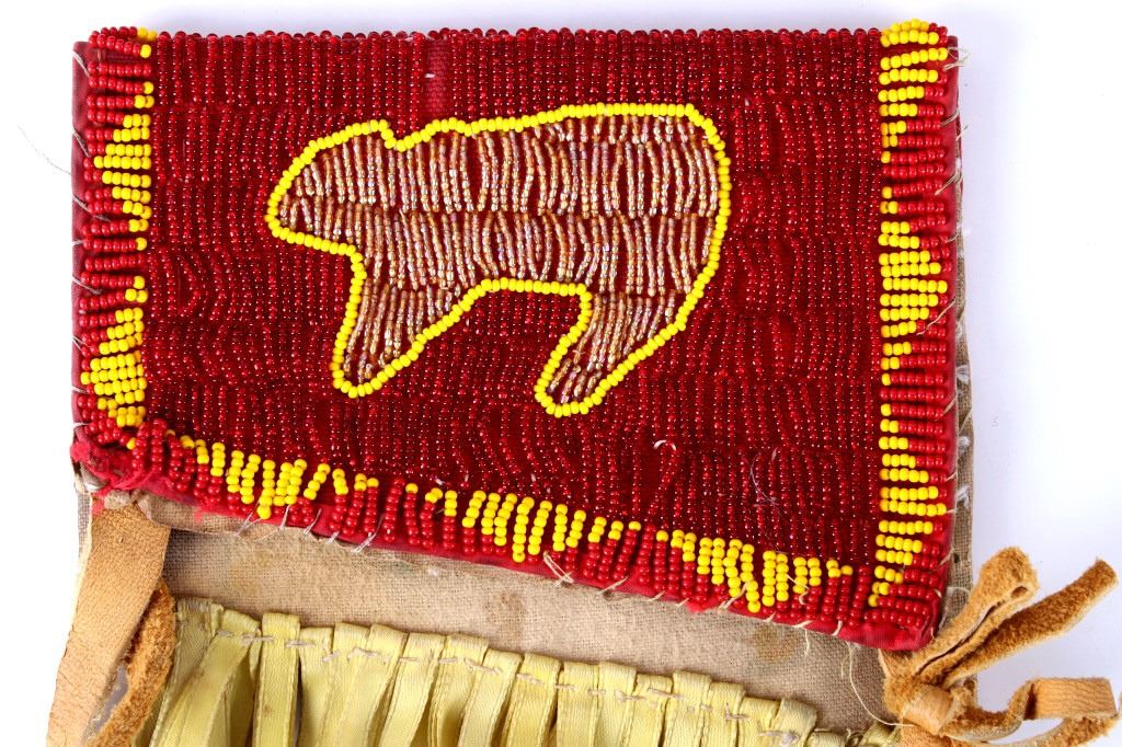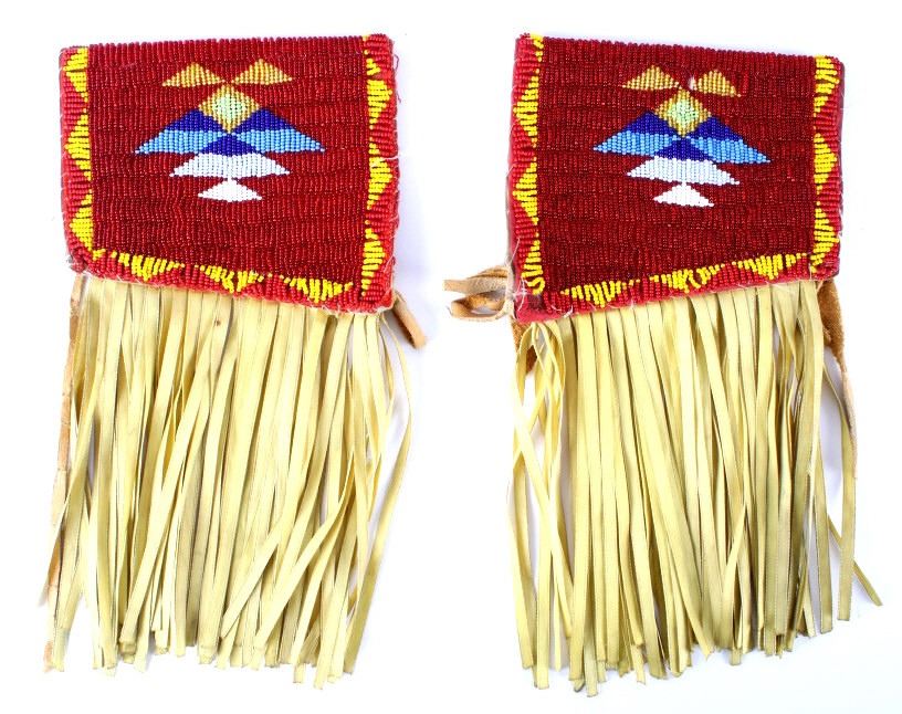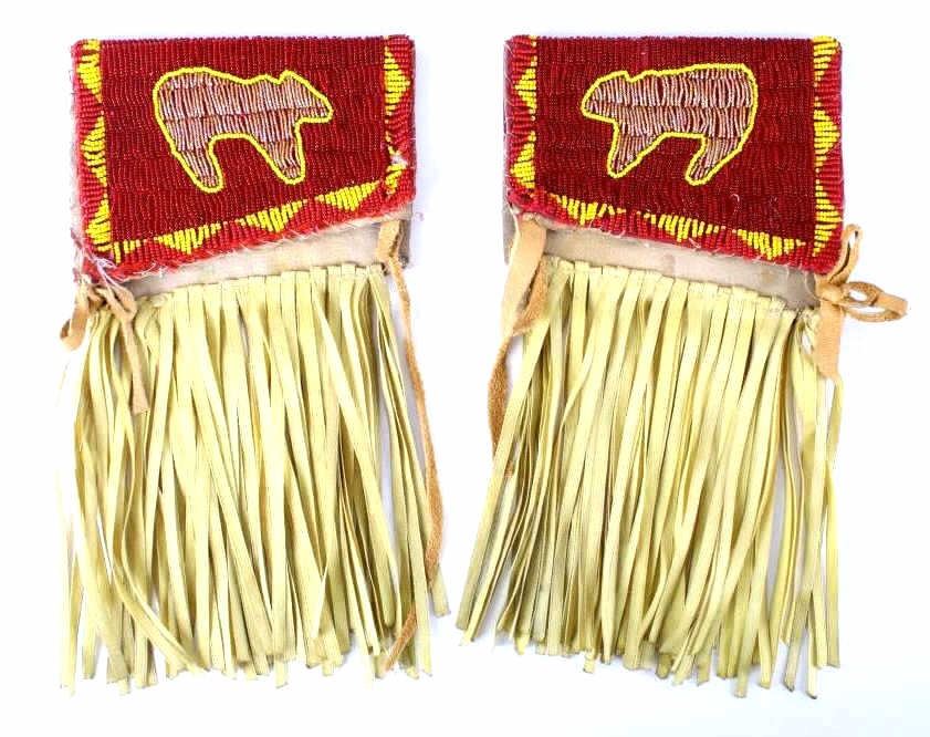 Offered for sale in this lot is a nice set of fully beaded men’s arm cuffs with Grizzly Bear beadwork from the Chippewa Cree Native American Indians dating to the circa 1950’s. The set shows a U.S. tent canvas or tipi canvas construction with early red trade clothe covering and is covered in a wonderful geometric and pictorial glass trade seed and pony beadwork. The beadwork shows a rare unusual semi-transparent red background with corn yellow, maroon, semi-transparent iridescent, chalk white, sky padre blue, medium green, cobalt and semi-transparent greasy yellow Grizzly Bear pictorial symbol and powerful geometric symbols. The set shows later added leather ties with yellow silk like ribbon fringe, an artful additional. The set shows overall good condition with some very slight bead loss. Each cuff measures when closed 6.5”L by 5.25”W with an additional 8”L fringe.