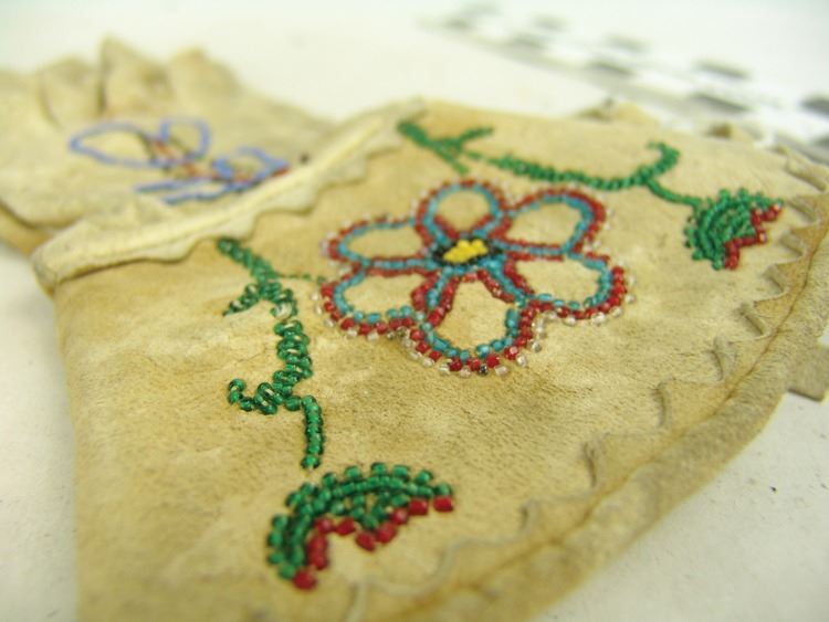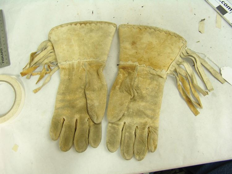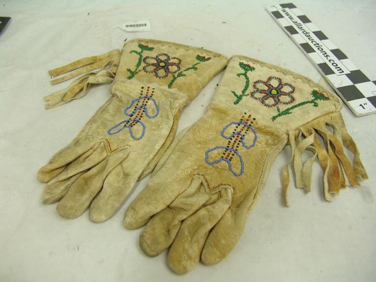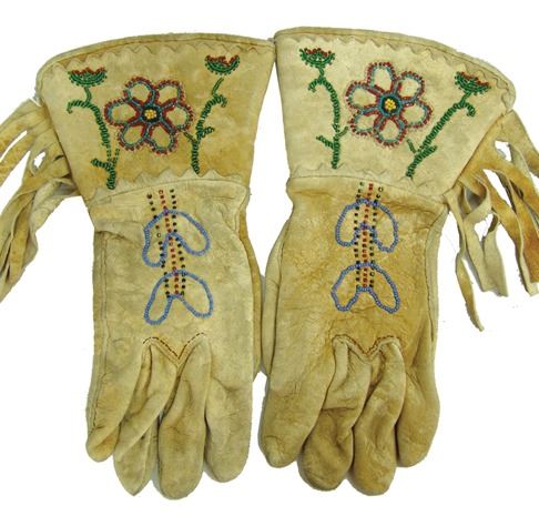 Traditional pair of hand and machine sewn all buckskin gloves with beaded floral accents, fringed sides, and scalloped trim. Very good condition.,Ca. 1930s-1940s,11" (BDWK)