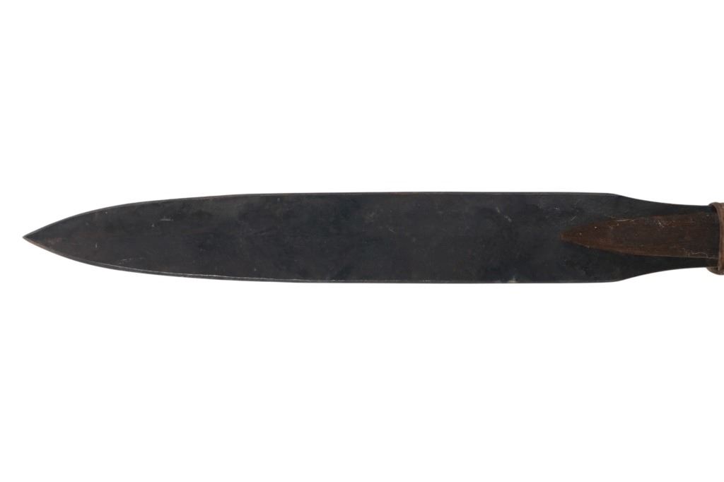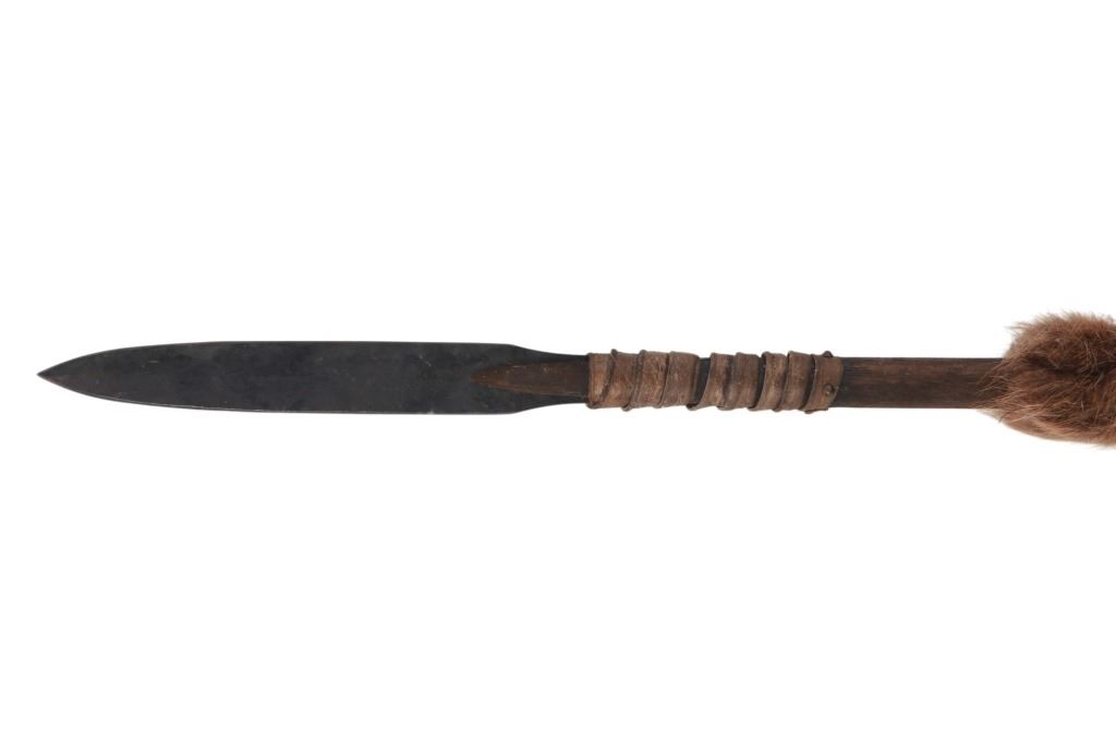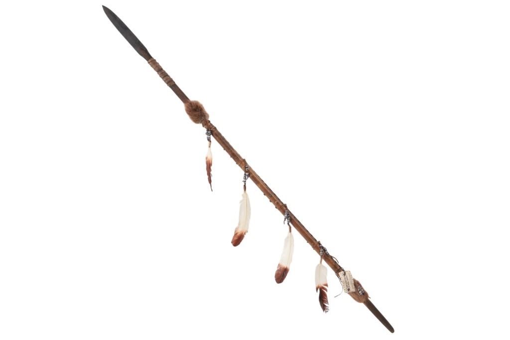Featured in this lot is this Chippewa Cree parfleche wrapped wood war lance made by Many Trails in the 20th Century, from the Many Trails Collection at the former Indian Nation Trading Post in Livingston, Montana. This war lance features a solid wood construction and is wrapped with parfleche through about seventy-five percent of the wood staff. Brass tacks are seen throughout the parfleche wrapping with adornments of turkey feathers, and large painted beads. Two tufts of fur adorn the staff with one at the bottom and one at the top. Near the steel lance head, a tacked parfleche wrap can be seen. The piece shows good condition overall with little wear present and no signs of damage noted. It measures 68 5/8" L x 1 1/2" W x 1 3/8" D and weighs 2 pounds and 8 ounces.