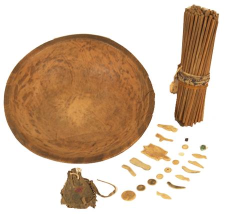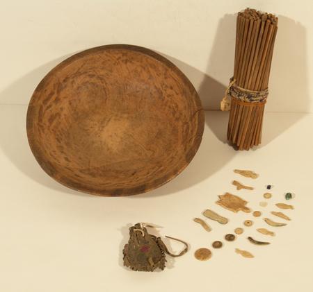 Very rare set consisting of a wooden bowl, carved bone and ivory objects (humans, turtle, ducks, birds, rifle, horse, spear, round discs, etc.), approximately 80 sticks of the same size, and a buckskin pouch with beaded trim. All wrapped in old cloth pouc
