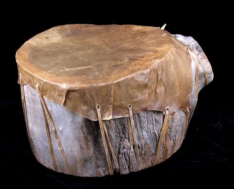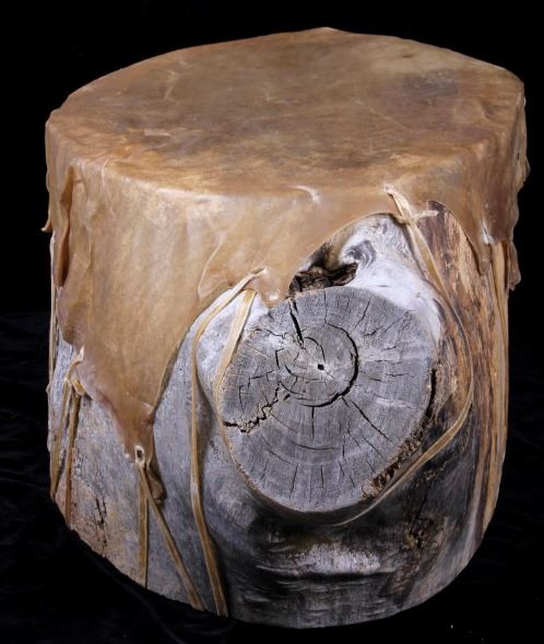Offered in this lot for your consideration is a Chippewa Native American Indian rawhide drum, crafted by Gloria Wells. The drum is constructed with a large tree stump, with thick 3" walls. and wrapped with stiff rawhide. The drums large make-up, and girthy walls make for a deep, resonating sound. The drum shows good condition overall, and originates from the early to mid 1900's. The drum measures approximately 35" long, 18 3/4" tall, and 22 3/4" wide.