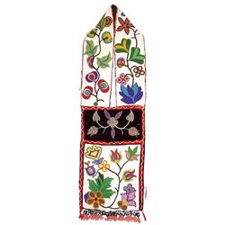 Chippewa Indian bandolier bag, fully beaded w/cut & seed beads, velvet center, sequins w/metallic beads, beautiful use of color & floral design, frayed silk along edges, but overall VG condition, c.1900, 47"L.
