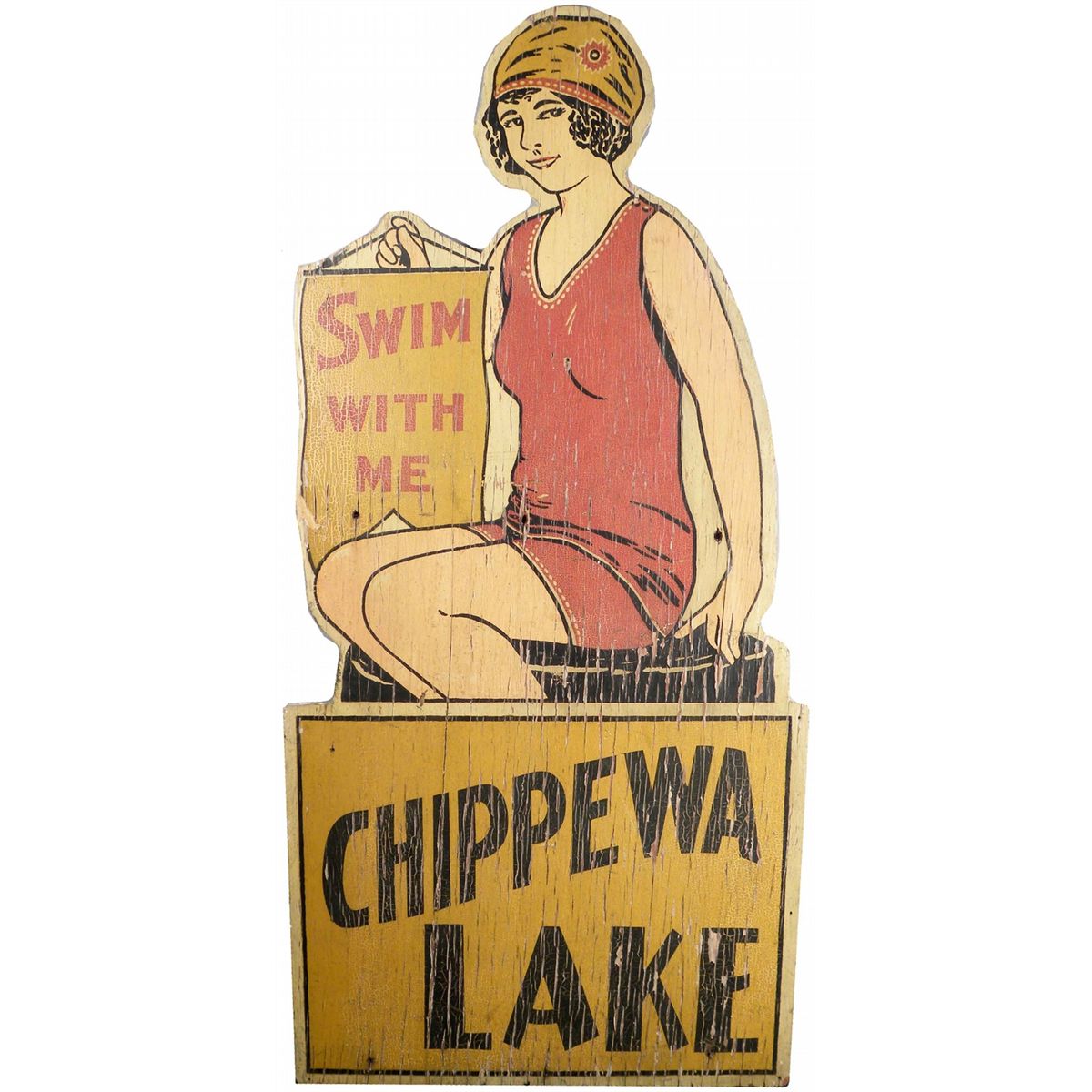 Chippewa Lake Die Cut Wood Outdoor Sign. "Swim with me". This sign came from Chippewa Lake Park, opened in 1878 and closed in 1978. Located near Medina, Ohio. Very good condition. 21 X 41 1/2 inches.
