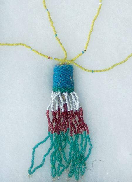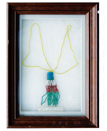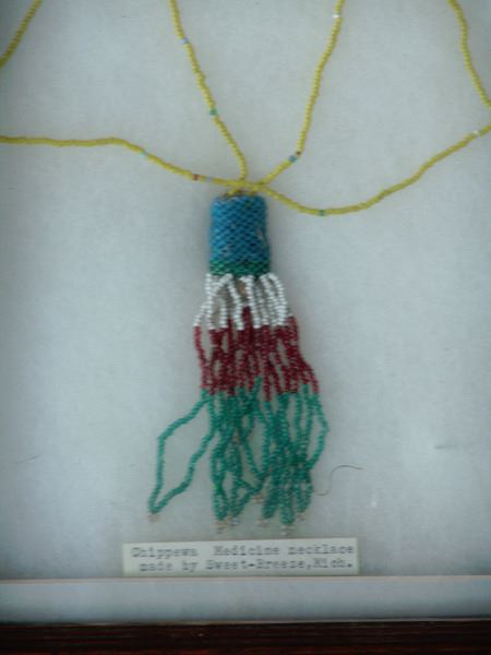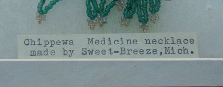 Early/Mid 1900s, Older seed bead necklace in shadow box display and labeled "Chippewa Medicine Necklace - Made by Sweet - Breeze, Mich." Good condition. In 14-1/4" x 10-1/4" frame
