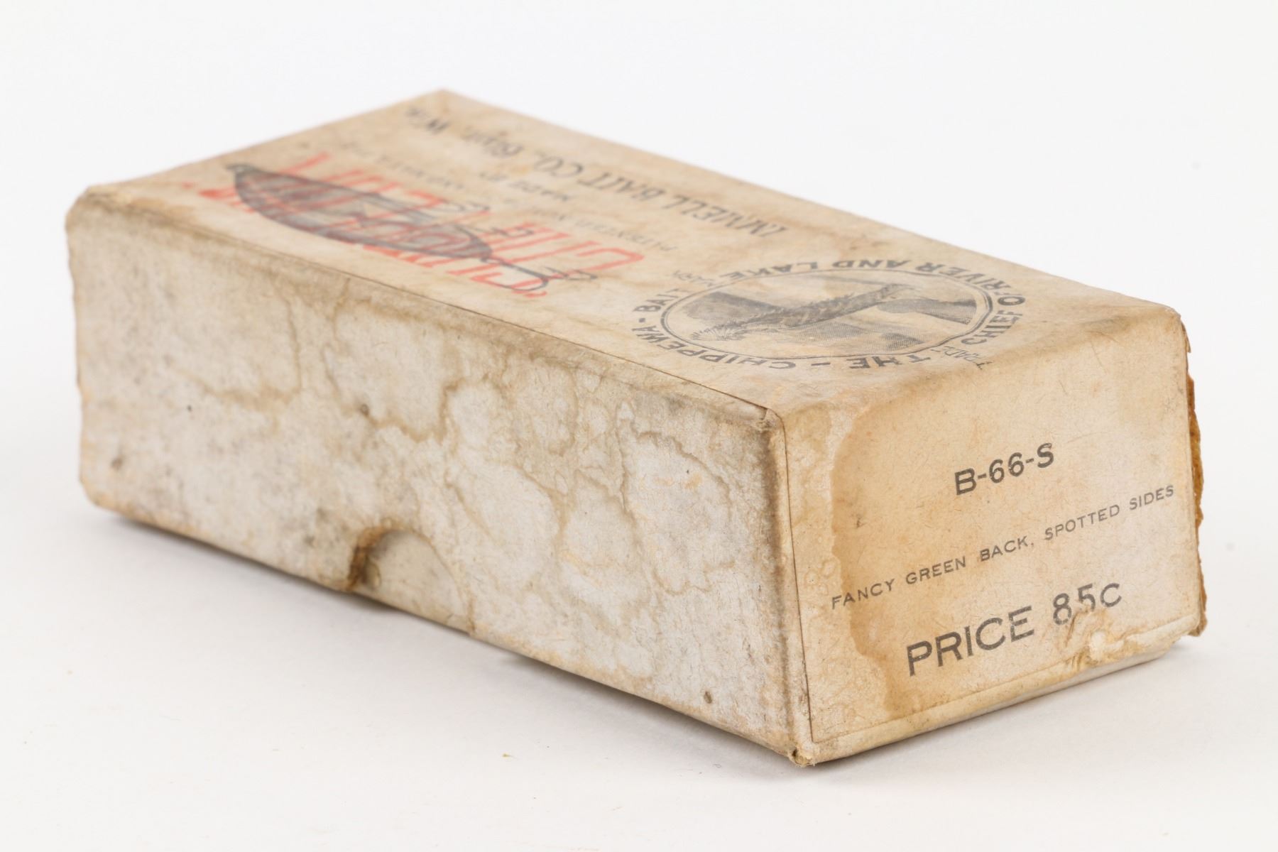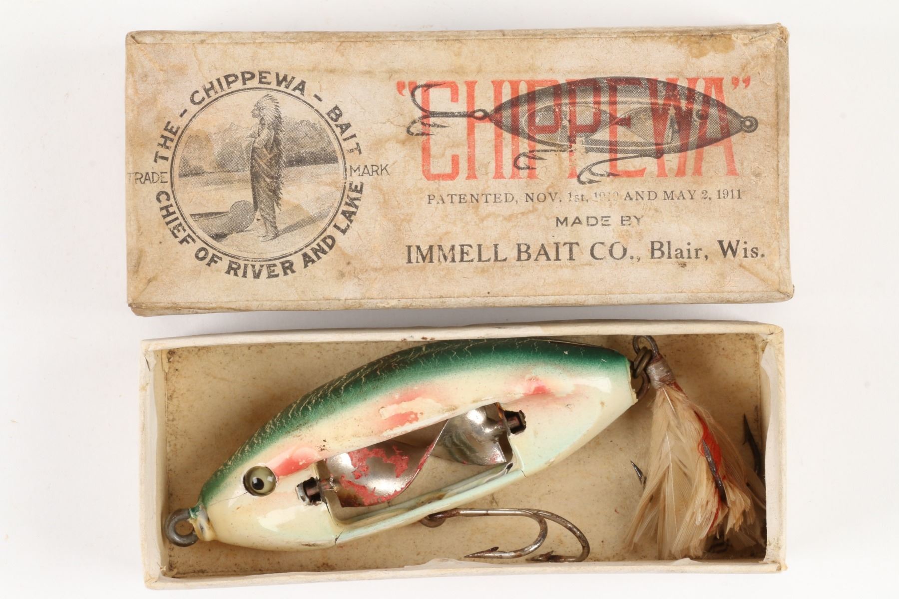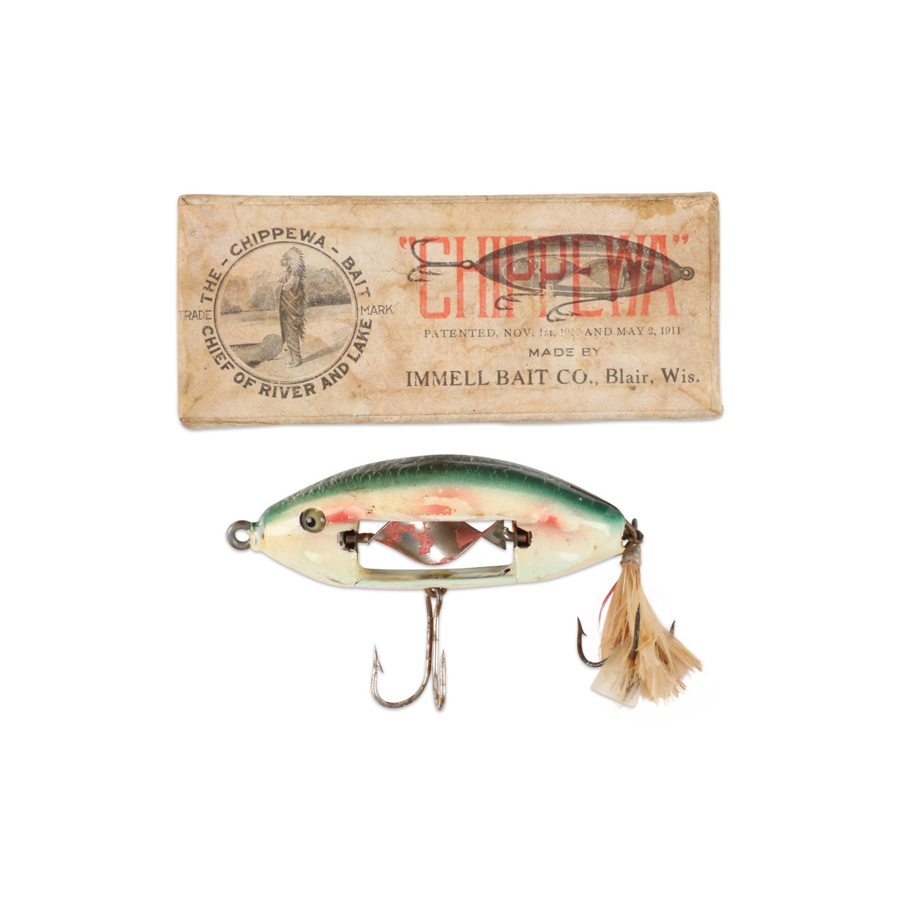 Immell Bait and Tackle Company, United States. 1910s. Boxed. Material: Wood. Quantity: 1. Grade: VG-. 4.25" box. Est. $2000-3000.
