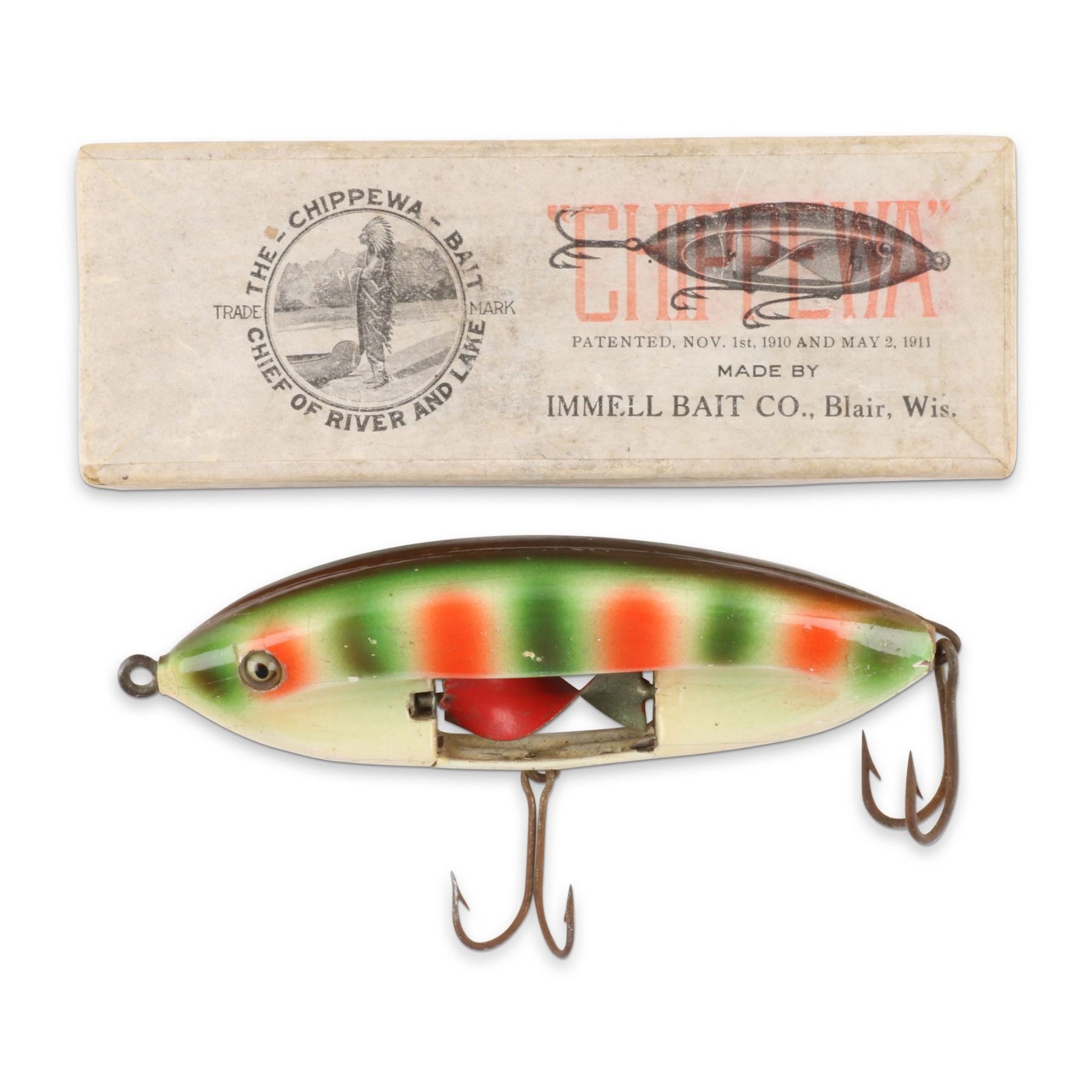 Immell Bait & Tackle Company, Blair, Wisconsin., United States. 1900s. Boxed. Material: Wood. Quantity: 1. Grade: VG. 5.25" x 1.75" x 1.25" Est. $2500-3500.