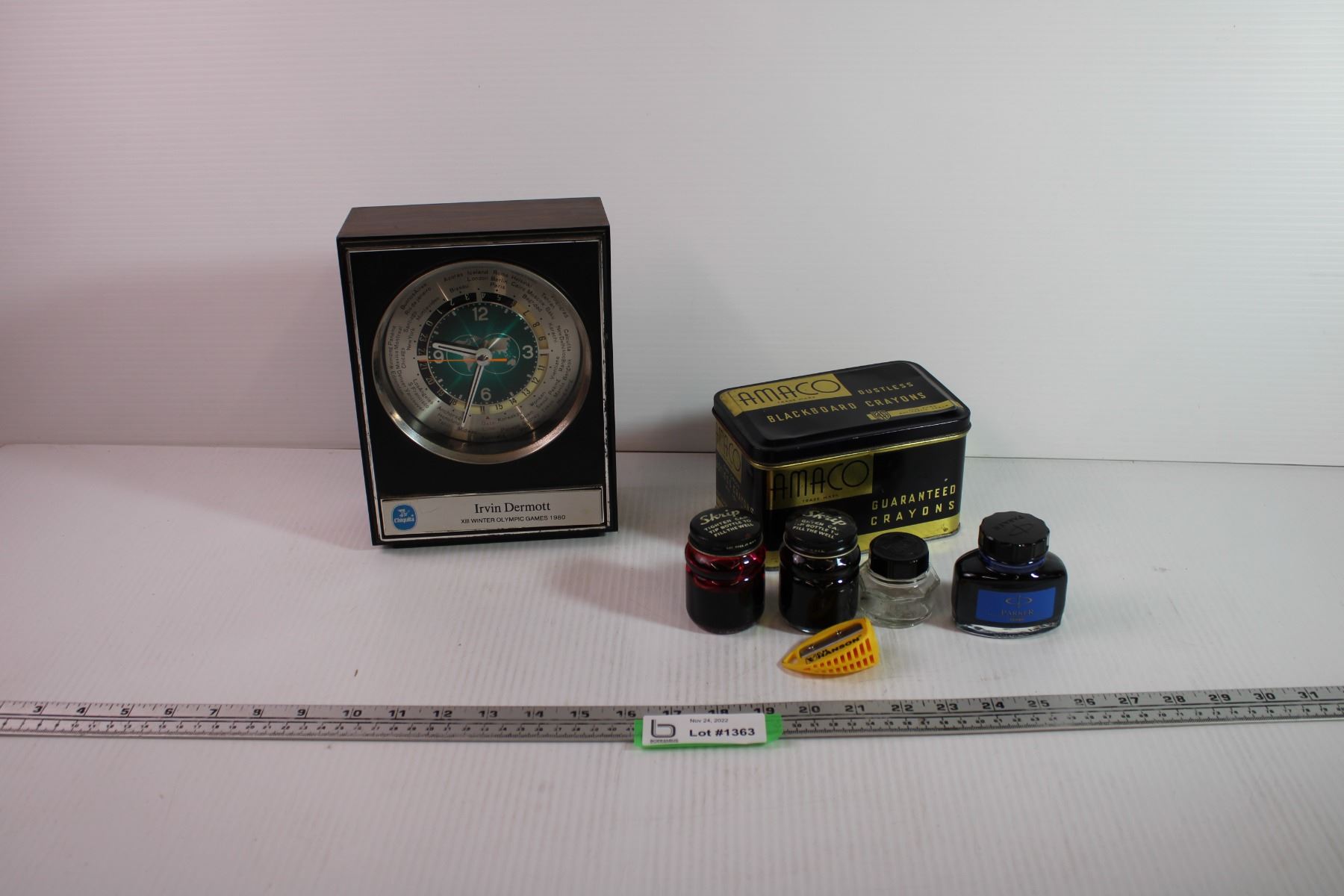 Chiquita 1980 Olympic Winter Games World Clock + Tin w/ 3 Bottles of Ink and Pencil Sharpener