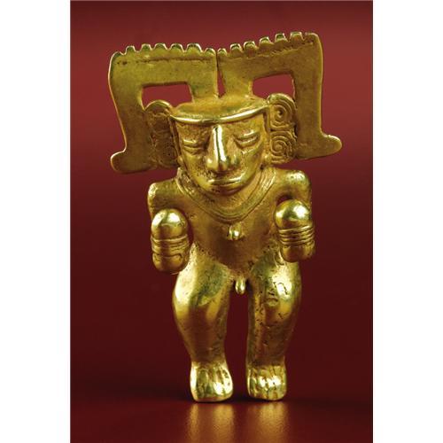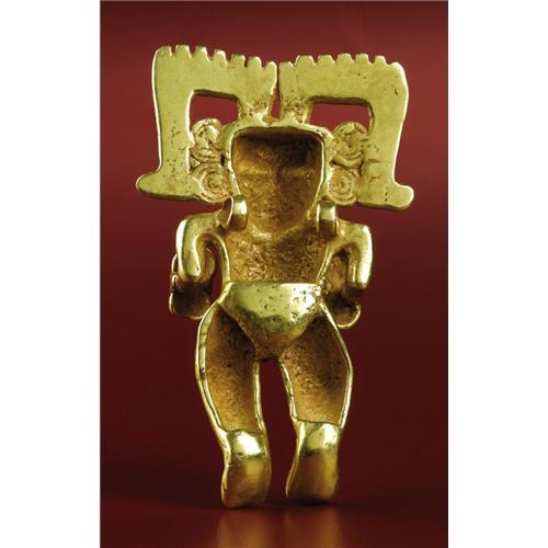 <B>Man with Rattles and Serrated Headdress</B></I><BR>Chiriquí<BR>A.D. 1000 - 1550<BR>Gold, Weight 61.1 grams<BR>Height 2 ¾ in. Width 2 5/8 in.<BR><BR>This frontal male figure stands with knees bent, grasping rounded gourd rattles in each hand. He wears a necklace with one round bead drop. On his head is a complex headdress of two open squares with a top serrated edge possibly depicting feathers. A band starting and ending with a circular plug stretches from jaw to temple and across the forehead, framing the face. Double whorls, possibly ear ornaments, almost fill the inner space of the N form on either side of the head. His coffee-bean eyes, closed lips, and prominent nose give the figure a trance-like appearance. The bent knees and elbows suggest a ritual dance.<BR><BR>Provenance<BR>Charles Craig, Santa Barbara<BR><BR>