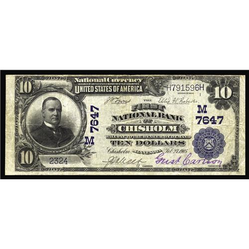 <B>Chisholm, MN</B></I> - $10 1902 Plain Back Fr. 624 <B>The First NB</B></I> Ch. # 7647<BR>Quite easily found in small size but hardly so in large. Attractive <B>Fine-Very Fine,</B></I> with a couple of short splits at the top more than offset by the pretty two color signatures.