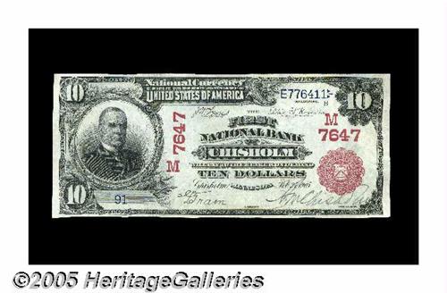 <B>Chisholm, MN</B></I> - $10 1902 Red Seal Fr. 613 <B>The First NB</B></I> Ch. # (M)7647<BR>This lovely note is a virtual twin to the $5 Red Seal offered above, with the same full originality and brightness more than offsetting a bit of handling and some margin irregularity. <B>Choice Crisp Uncirculated.</B></I>