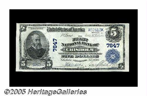 <B>Chisholm, MN</B></I> - $5 1902 Plain Back Fr. 598 <B>The First NB</B></I> Ch. # 7647<BR>A fully margined and crackling-fresh example with simply superlative colors for a Blue Seal. There is the slightest evidence of handling, but to call this utterly gorgeous item less than <B>Gem Crisp Uncirculated</B></I> would be a total mockery.