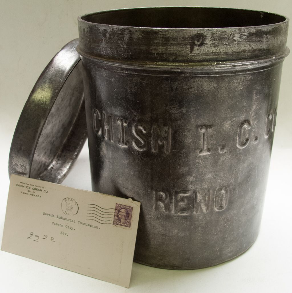 HOLY COW - it weights 8 1/2 pounds! It will keep your ice cream cold. Side says 'Chism I. C. Co. Reno.' Includes a 1918 envelope with a corner advertisement for Chism Ice Cream Company. There will be an extra charge for shipping on this item.