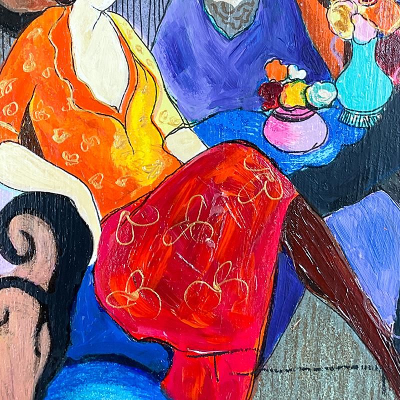 "Chit Chat" is a one-of-a-kind mixed media over paint on wood by Itzchak Tarkay (1935-2012), hand signed by the artist. This piece comes custom framed. Includes Letter of Authenticity. Measures approx. 17" x 15" (frame), 9" x 7" (image).