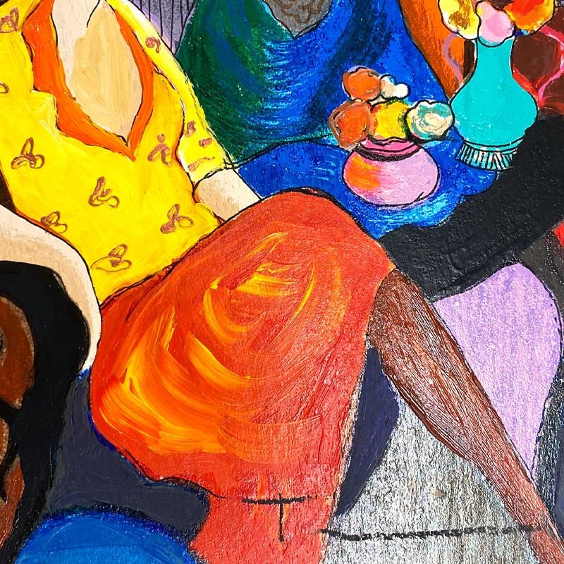 "Chit Chat" is a one-of-a-kind mixed media over paint on wood by Itzchak Tarkay (1935-2012), hand signed by the artist. Includes Letter of Authenticity. Measures approx. 9" x 7" (image).