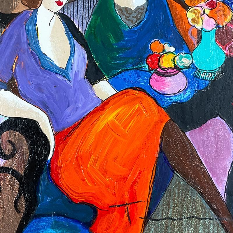 "Chit Chat" is a one-of-a-kind mixed media over paint on wood by Itzchak Tarkay (1935-2012), hand signed by the artist. This piece comes custom framed. Includes Letter of Authenticity. Measures approx. 17" x 15" (frame), 9" x 7" (image). This item requires special handling and may have a longer than usual turnaround.